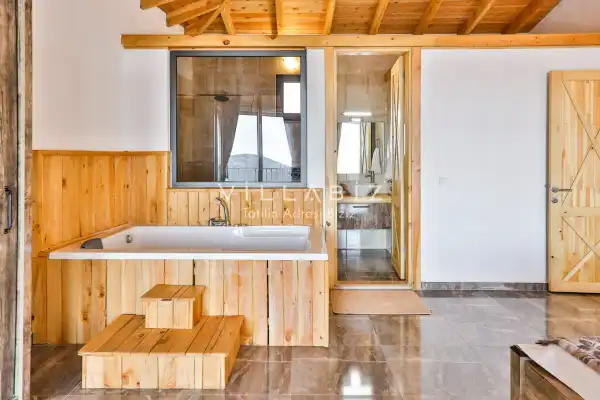 The villa has 2 bedrooms and can accommodate 4 people. The first bedroom has a comfortable double bed, air conditioning, wardrobe, and a jacuzzi in the en-suite bathroom. The second bedroom also has a comfortable double bed, air conditioning, and a wardrobe. The living room features a modern seating area, television, air conditioning, and a fully equipped open-plan kitchen and bathroom. The kitchen is fully equipped with a refrigerator, stove, oven, dinnerware, and basic kitchen appliances.