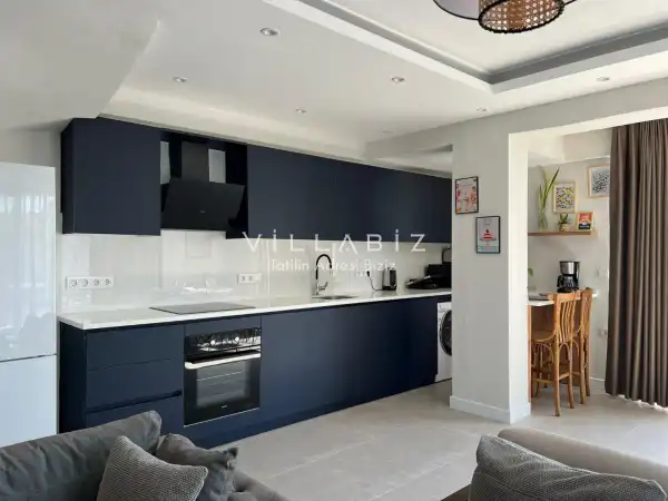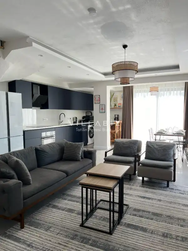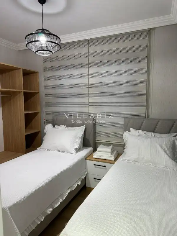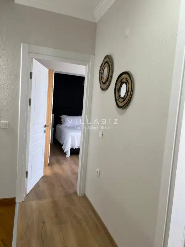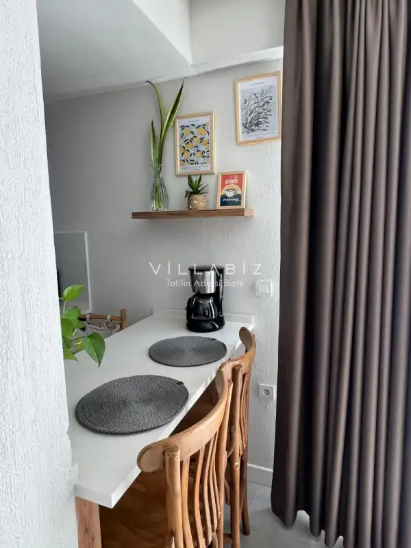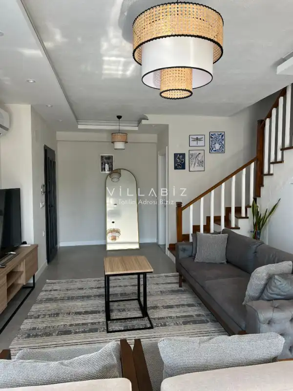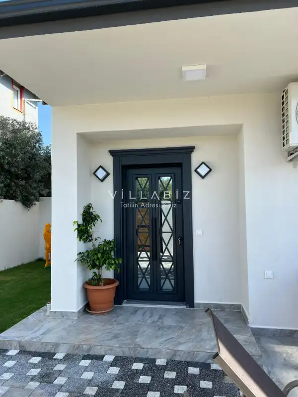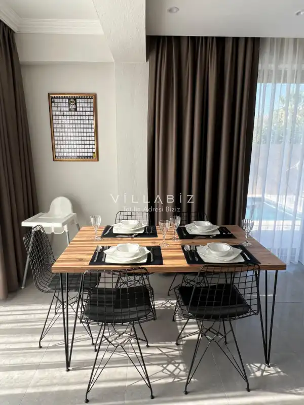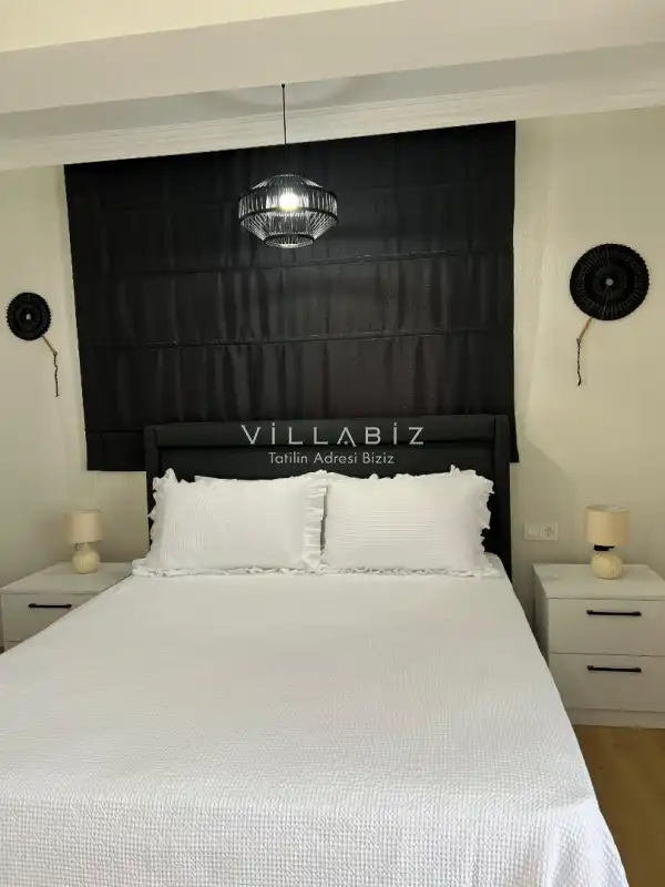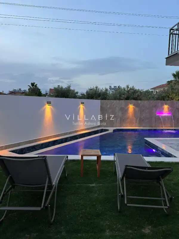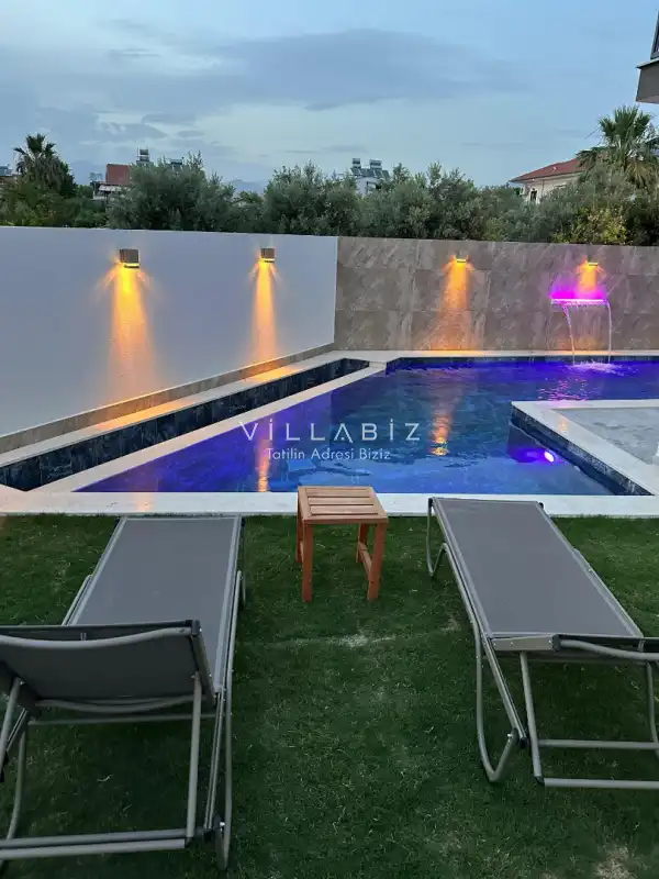 It consists of 2 bedrooms in total and has a capacity of 4 people. It is ideal for nuclear families and groups of friends. Everything has been thought of for our guests in our villa, which is furnished in a very stylish and modern way. You can sunbathe on the sun loungers on the pool terrace, eat wonderful meals at the garden table, and have pleasant moments swinging on the swing.
