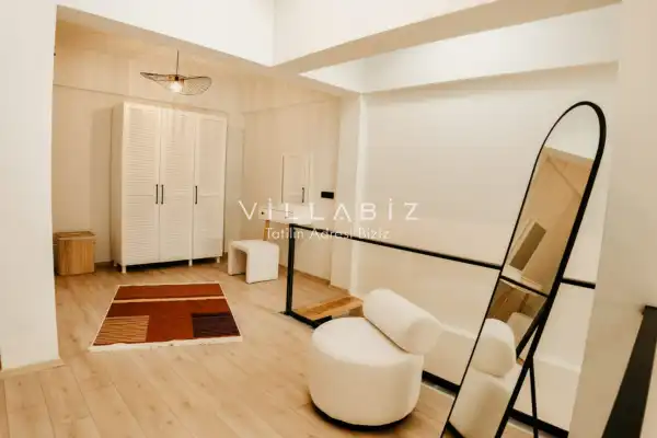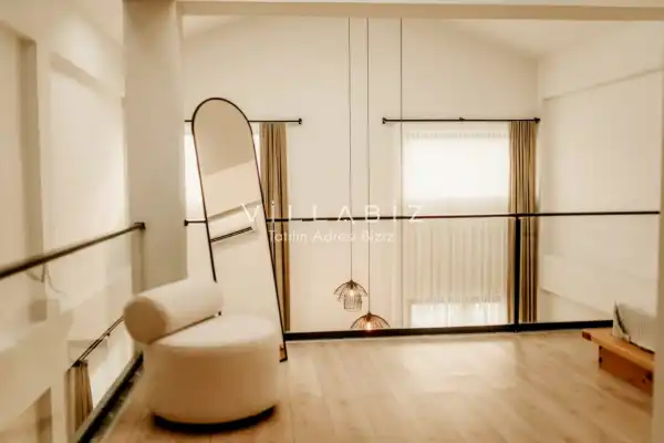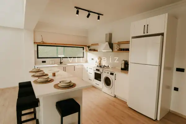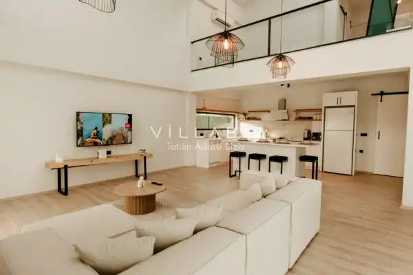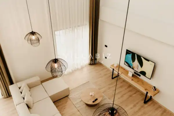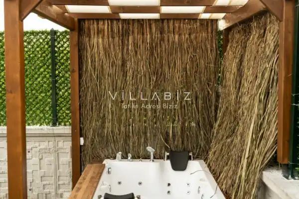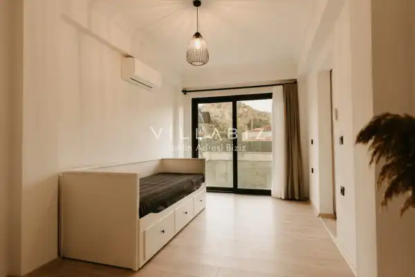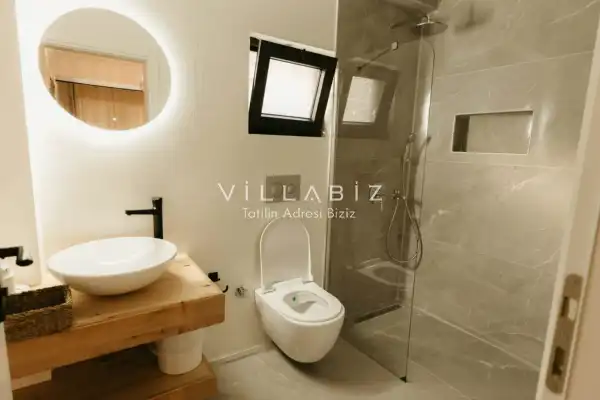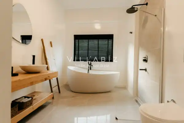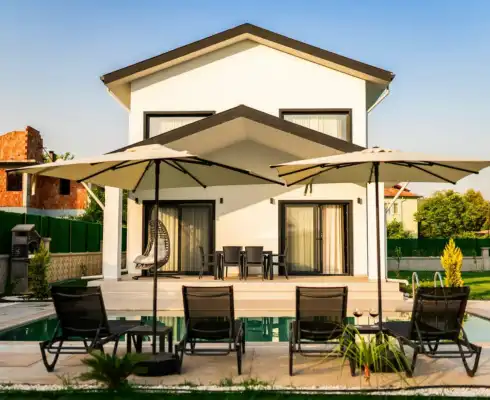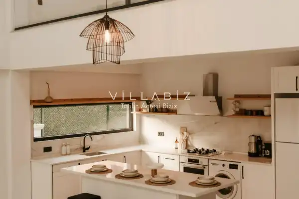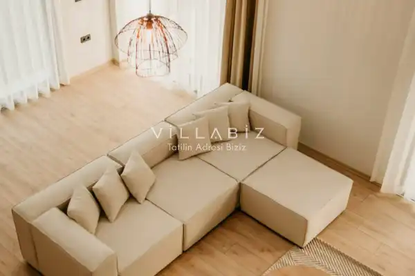 It consists of a total of 2 bedrooms and can accommodate 3 people. It is ideal for nuclear families, groups of friends and honeymoon couples. Everything has been considered for our guests in our villa, which is furnished in a very stylish and modern way. You can sunbathe on the sun loungers on the pool terrace, eat wonderful meals at the garden table, or swing on the swings and have pleasant moments.