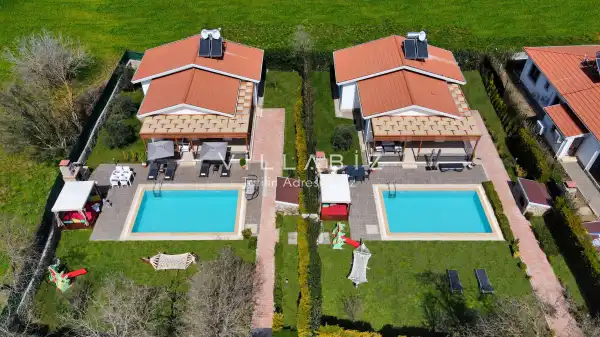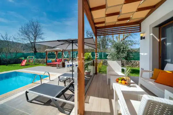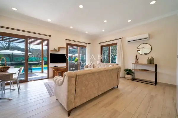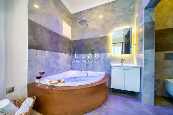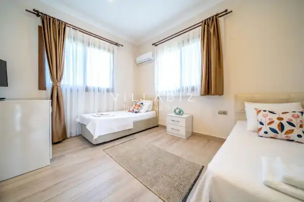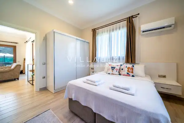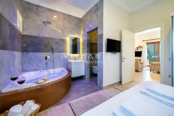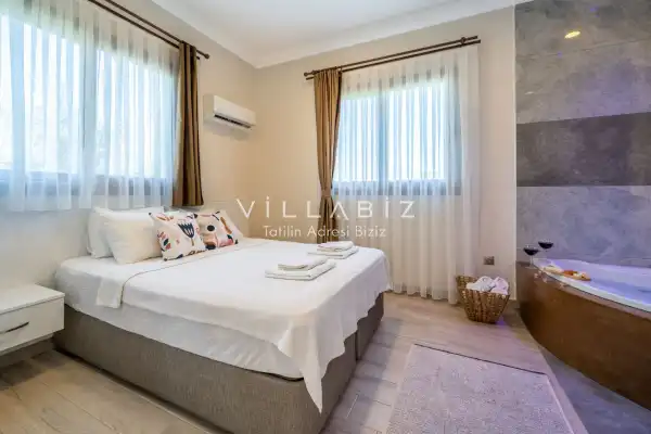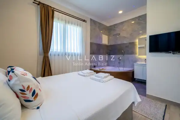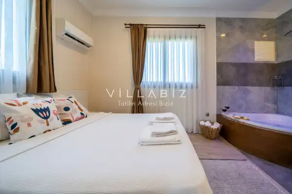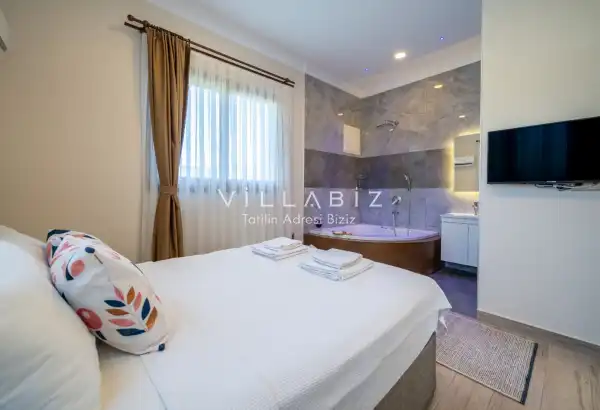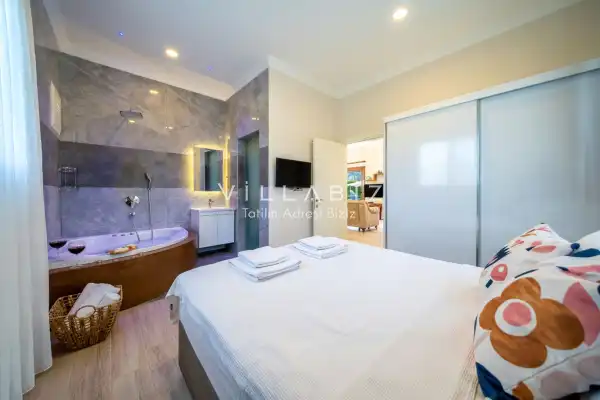 Villa Calvin has a capacity of 5 people and has 2 bedrooms. Both rooms of the villa have a bathroom and a jacuzzi. It has an open kitchen and a pool in its own garden. The kitchen has a dishwasher, refrigerator, built-in oven, toaster and almost all the utensils needed in the kitchen. Besides the private pool in the garden of the villa, there is also a children's pool for children. Barbecue, table, chairs, sun loungers and umbrellas allow you to enjoy the garden without limits. In the living room, there is a seating group, television and furniture, while there is separate air conditioning for all rooms.