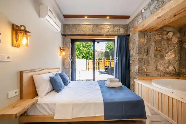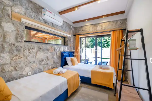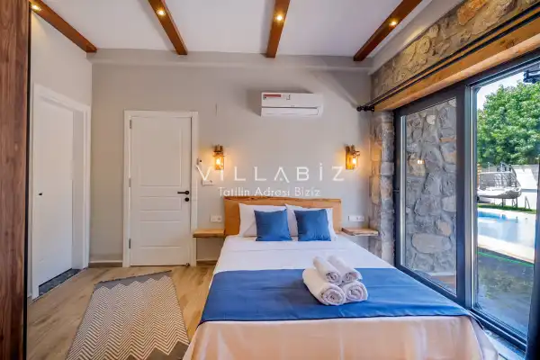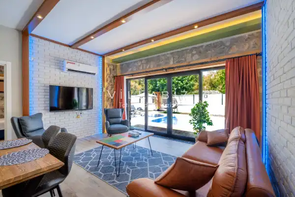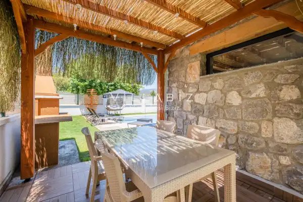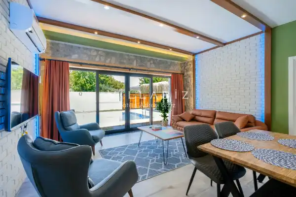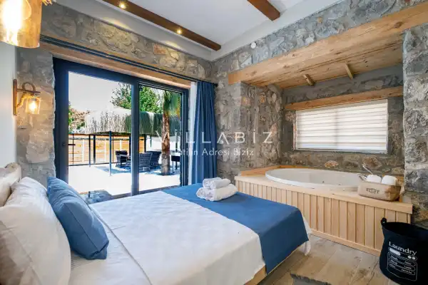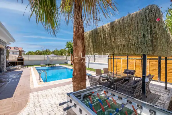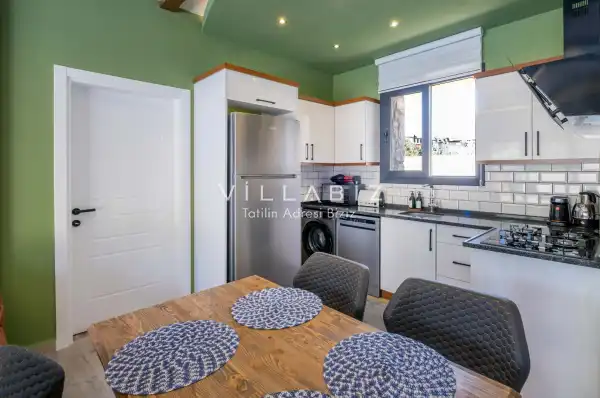 Villa Demo has a capacity of 4 people and has 2 bedrooms. Both rooms of the villa have a bathroom and a jacuzzi. It has an open kitchen and a pool in its own garden. The kitchen has a dishwasher, refrigerator, built-in oven, toaster and almost all the utensils needed in the kitchen. Besides the private pool in the garden of the villa, there is also a children's pool for children. Barbecue, table, chairs, sun loungers and umbrellas allow you to enjoy the garden without limits. In the living room, there is a seating group, television and furniture, while there is separate air conditioning for all rooms.