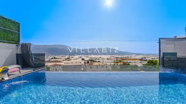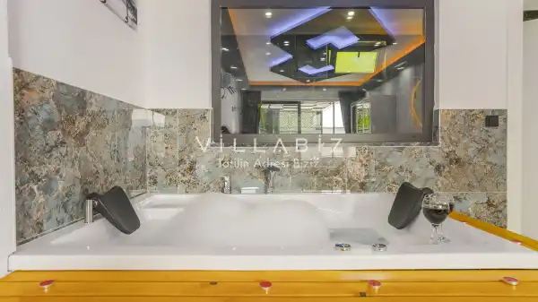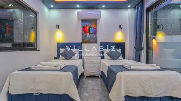 The villa has 2 bedrooms and accommodates 4 people. The first bedroom features a comfortable double bed, air conditioning, wardrobe, jacuzzi, and an en-suite bathroom. The second bedroom has two comfortable single beds, air conditioning, wardrobe, and an en-suite bathroom. The living room includes a modern seating area, television, air conditioning, and a fully equipped open-plan kitchen. The kitchen is fully equipped with a refrigerator, stove, oven, dinnerware, and basic kitchen appliances.