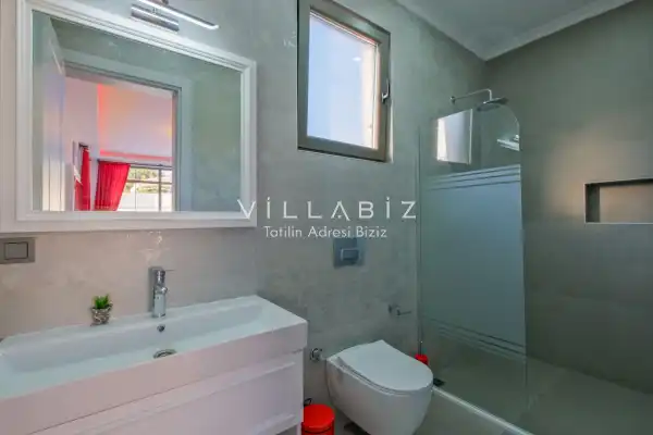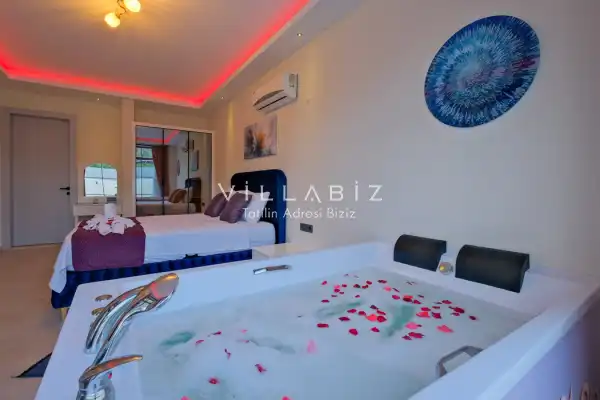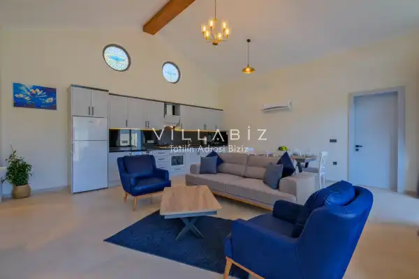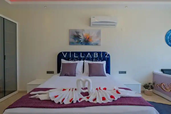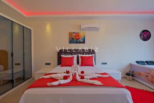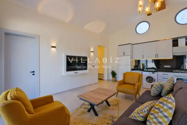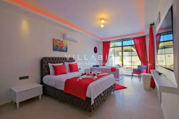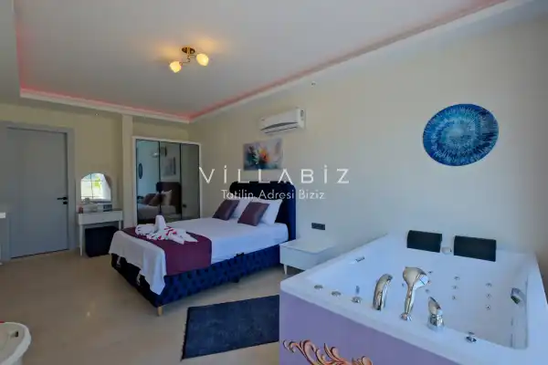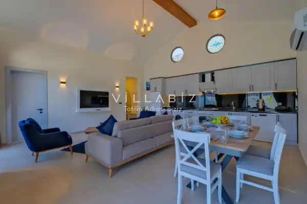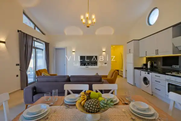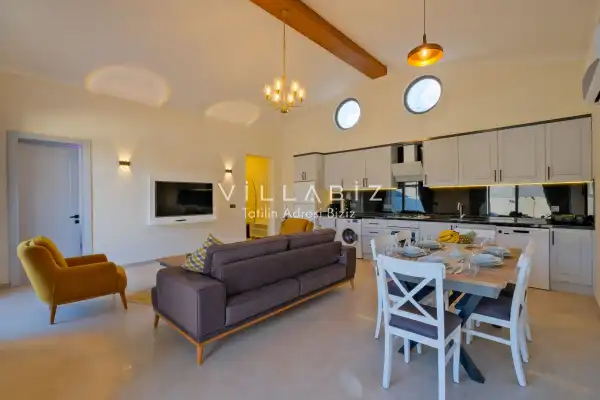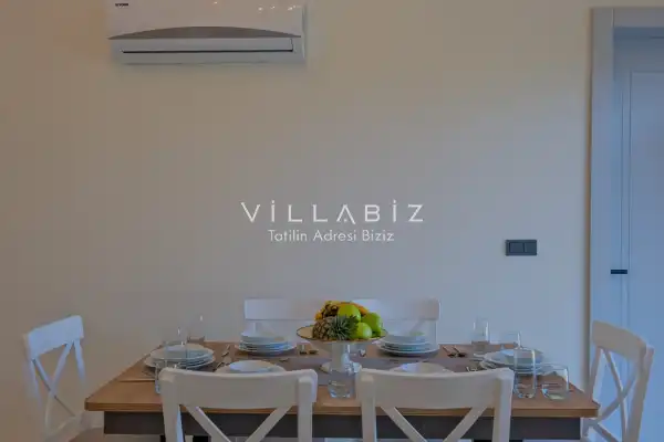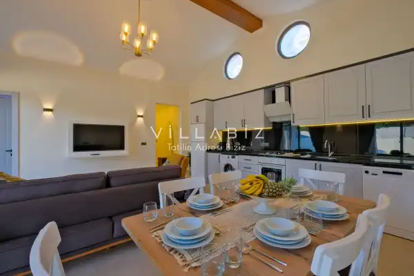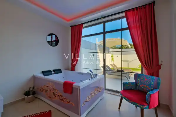 Villa Kayı 5 has 2 bedrooms in the villa with a capacity of 4 people. The villa has a bathroom and a jacuzzi. It has an open kitchen and a pool in its own garden. The kitchen has a dishwasher, refrigerator, built-in oven, toaster and almost all the utensils needed in the kitchen. Barbecue, table, chairs, sun loungers and umbrellas allow you to enjoy the garden without limits. In the living room, there is a seating group, television and furniture, while there is separate air conditioning for all rooms.