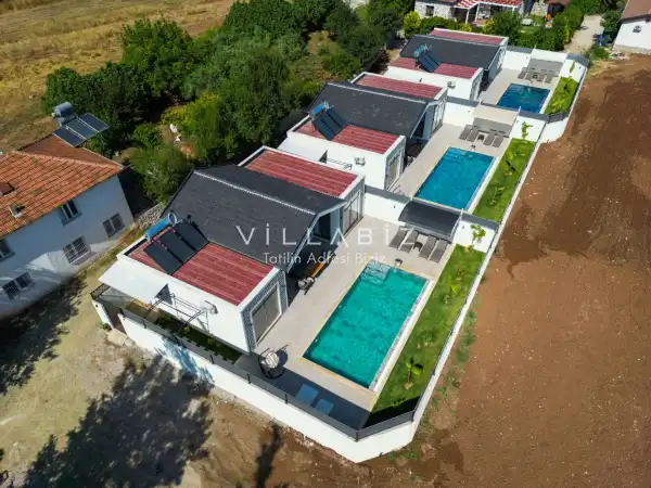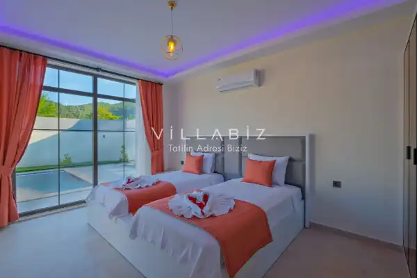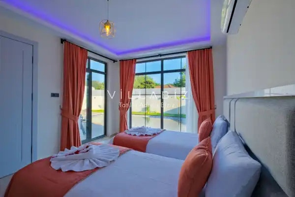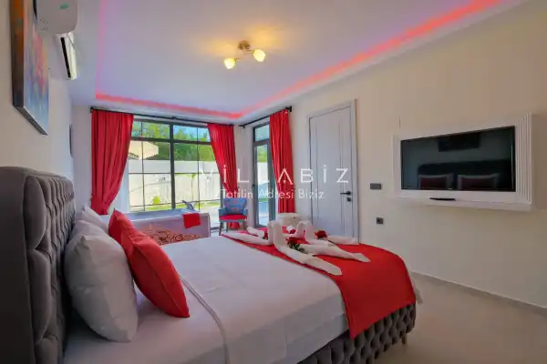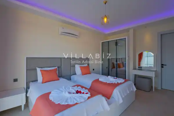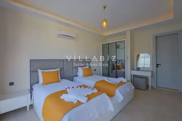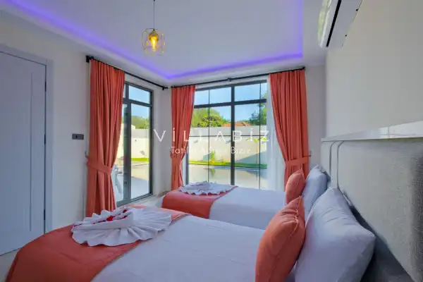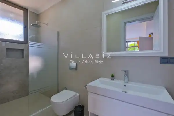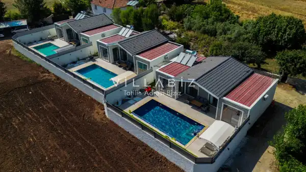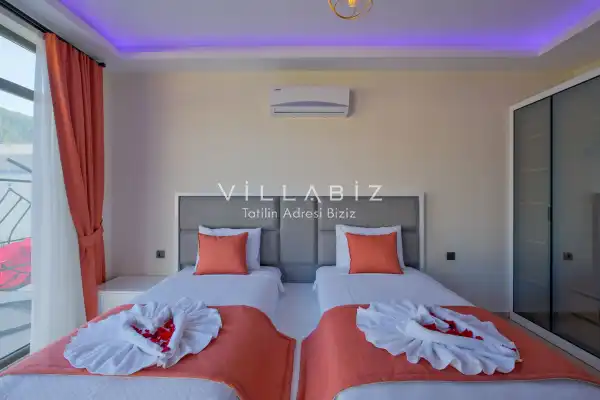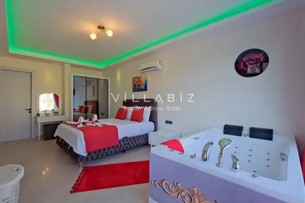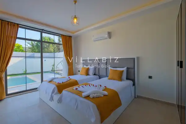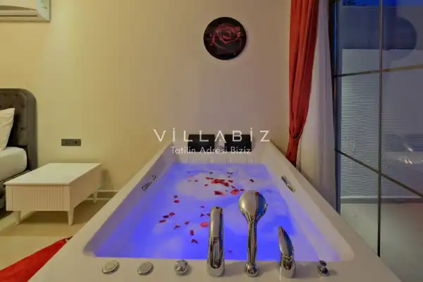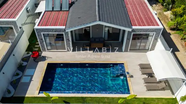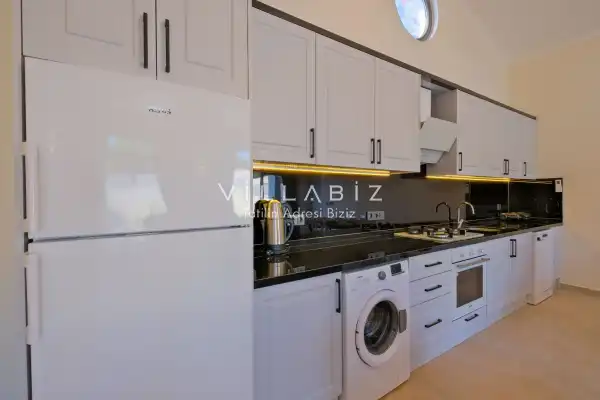 Villa Kayı 5 has 2 bedrooms in the villa with a capacity of 4 people. The villa has a bathroom and a jacuzzi. It has an open kitchen and a pool in its own garden. The kitchen has a dishwasher, refrigerator, built-in oven, toaster and almost all the utensils needed in the kitchen. Barbecue, table, chairs, sun loungers and umbrellas allow you to enjoy the garden without limits. In the living room, there is a seating group, television and furniture, while there is separate air conditioning for all rooms.