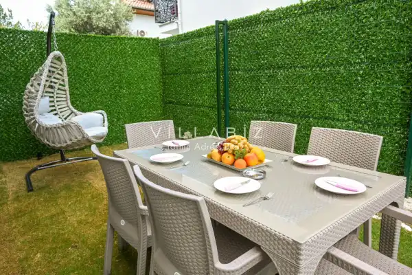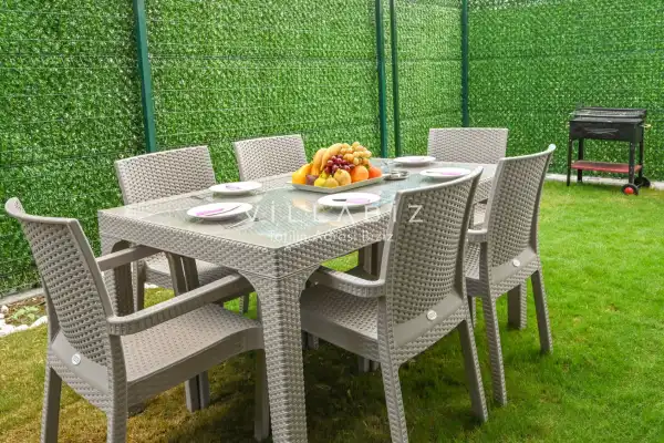 The villa has a total of 4 bedrooms and can accommodate up to 6 people. It is ideal for large families and groups of friends. The villa is furnished in a very stylish and modern style, with everything considered for our guests. You can sunbathe on the sun loungers on the pool terrace, enjoy wonderful meals at the garden table, and relax on the swing.