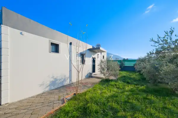 The villa has 2 bedrooms and can accommodate 4 people. The first bedroom has a comfortable double bed, air conditioning, wardrobe, jacuzzi, and en-suite bathroom. The second bedroom has two comfortable single beds, air conditioning, wardrobe, and an en-suite bathroom. The living room features a modern seating area, television, air conditioning, and a fully equipped open-plan kitchen. The kitchen is fully equipped with a refrigerator, stove, oven, dinnerware, and basic kitchen appliances.