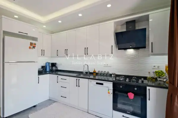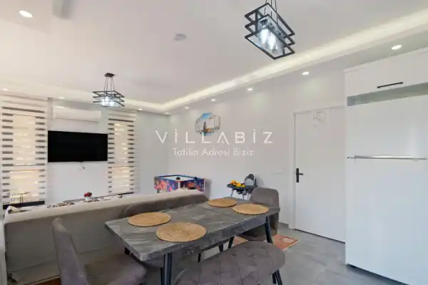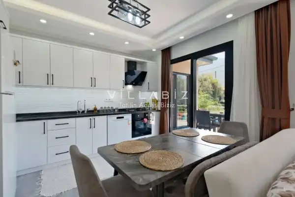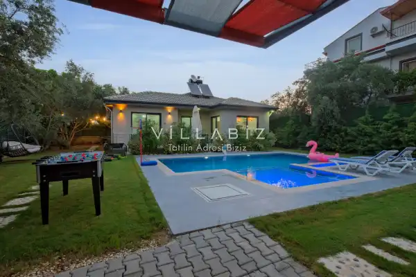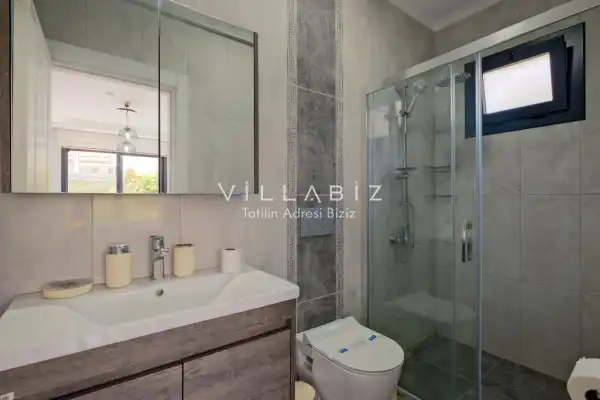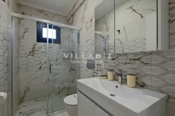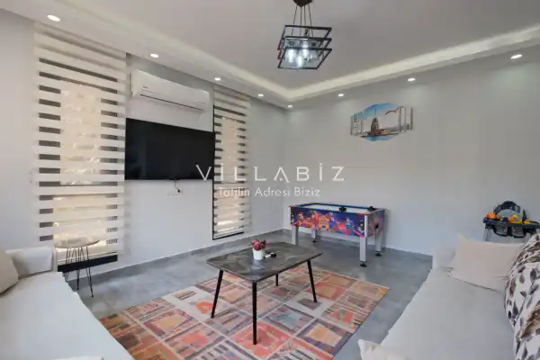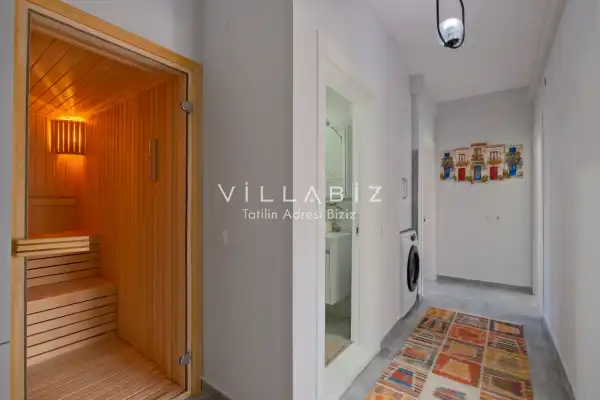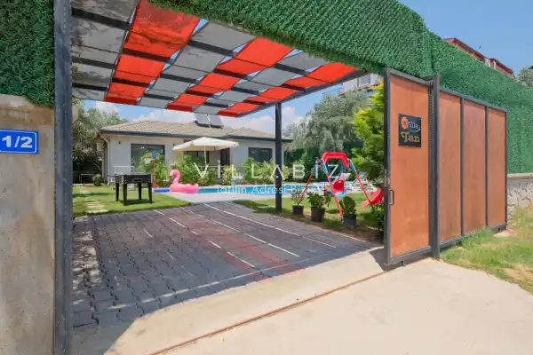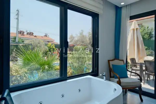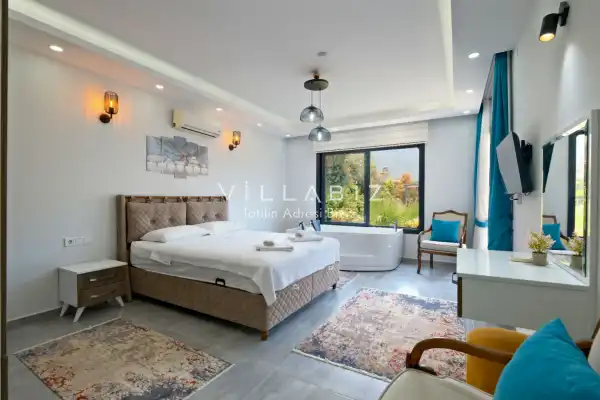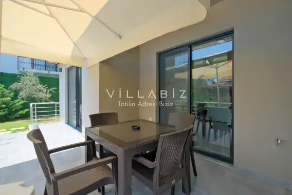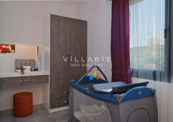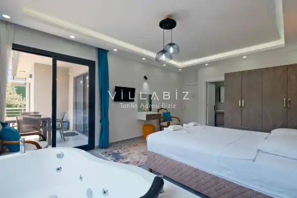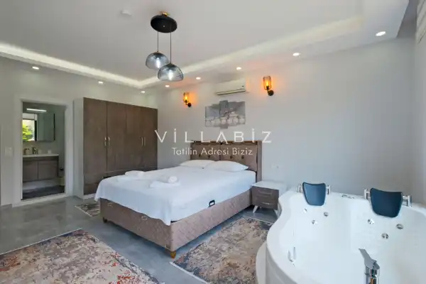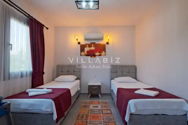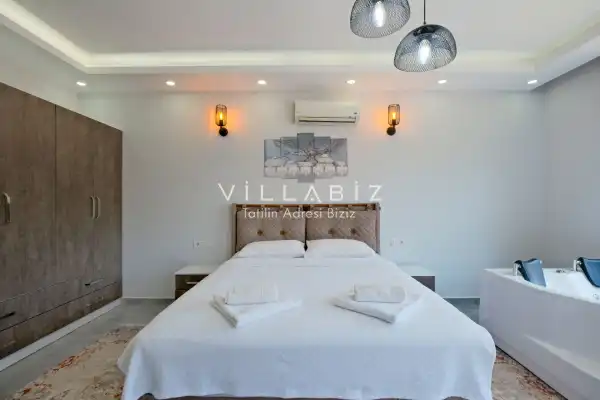 Villa Tan, with a capacity of 4 people, has 2 bedrooms. There is a bathroom in each of the two rooms of the villa and a jacuzzi in one bedroom. It has an open kitchen and its own garden. There is a dishwasher, refrigerator, built-in oven, and almost all the appliances needed in the kitchen. There is a private pool in the garden of the villa. Barbecue, table, chairs, sun loungers and umbrellas allow you to enjoy the garden without limits. There is a seating group, television, furniture in the living room, and there is separate air conditioning for all rooms.