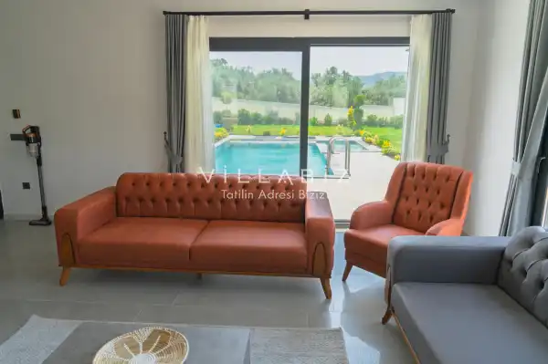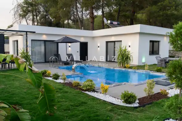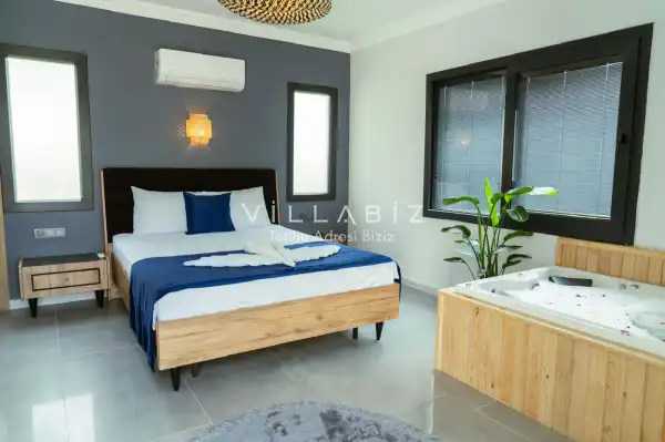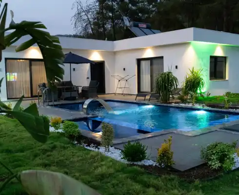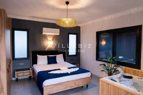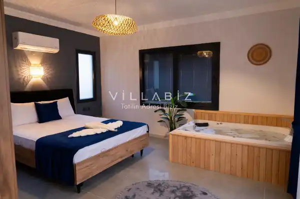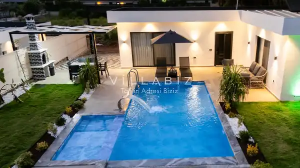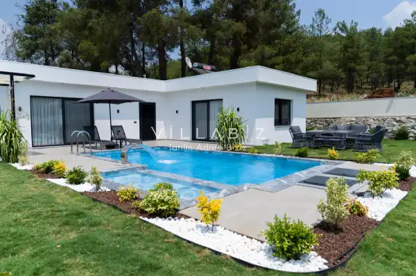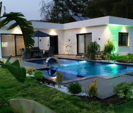 It has two bedrooms and can accommodate up to five people. It's ideal for large families and large groups of friends. Furnished in a stylish and modern style, our villa has everything our guests need. You can sunbathe on the sun loungers on the pool terrace, enjoy delicious meals at the garden table, or enjoy a relaxing time swinging on the swing.