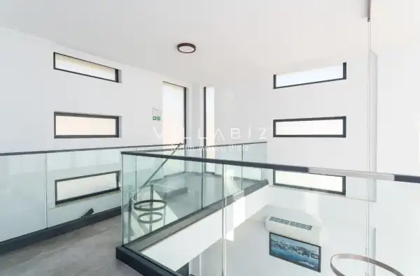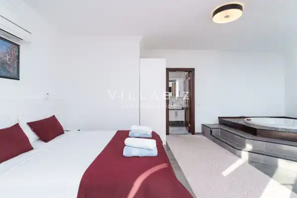 The villa has 2 bedrooms and can accommodate 4 people. The first bedroom has a comfortable double bed, air conditioning, wardrobe, jacuzzi, and en-suite bathroom. The second bedroom has two comfortable single beds, air conditioning, wardrobe, and an en-suite bathroom. The living room features a modern seating area, television, air conditioning, and a fully equipped open-plan kitchen. The kitchen is fully equipped with a refrigerator, stove, oven, dinnerware, and basic kitchen appliances.