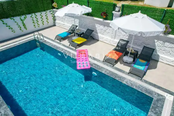 It consists of a total of 4 bedrooms and has an accommodation capacity of 8 people. It is ideal for large families and large groups of friends. Everything has been considered for our guests in our villa, which is furnished in a very stylish and modern way. You can sunbathe on the sun loungers on the pool terrace, eat delicious meals at the garden table, or swing on the swings and have pleasant moments.