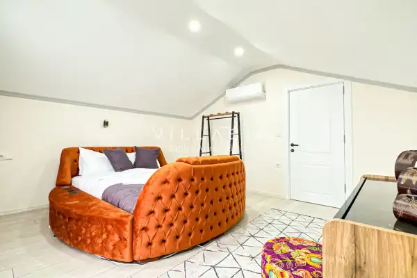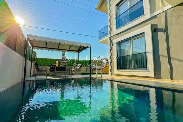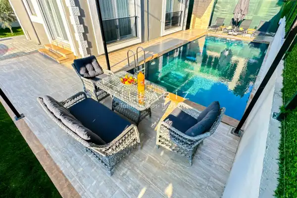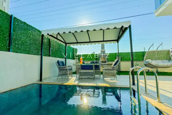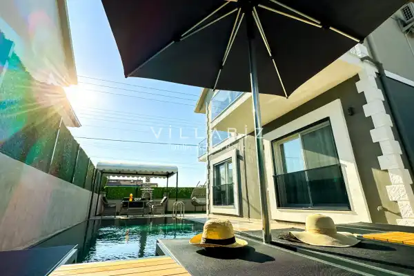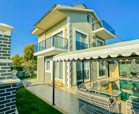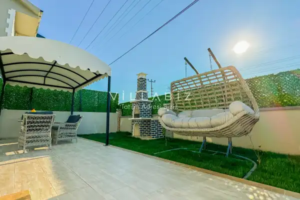 It has a total of 3 bedrooms and can accommodate 6 people. It is ideal for large families and groups of friends. The villa is furnished in a very stylish and modern style, and everything has been thought of for our guests. You can sunbathe on the sun loungers on the pool terrace, enjoy wonderful meals at the garden table, and spend pleasant moments swinging on the swing.
