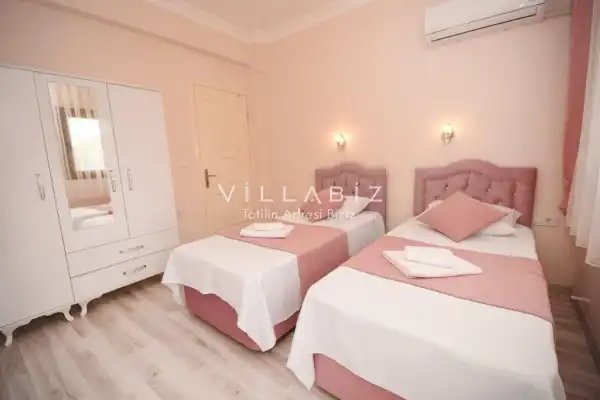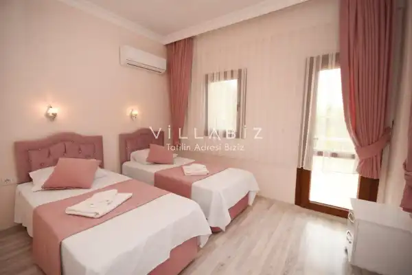 Toplam 4 yatak odasından oluşmuş, 7 kişi konaklama kapasitesine sahiptir. Geniş aileler ve kalabalık arkadaş grupları için oldukça idealdir. Oldukça şık ve modern bir şekilde döşenmiş olan villamızda misafirlerimiz için her şey düşünülmüştür. Havuz terasında bulunan şezlonglarda güneşlenebilir, bahçe masasında muhteşem yemekler yiyebilir, salıncakta sallanıp keyifli dakikalar geçirebilirsiniz.