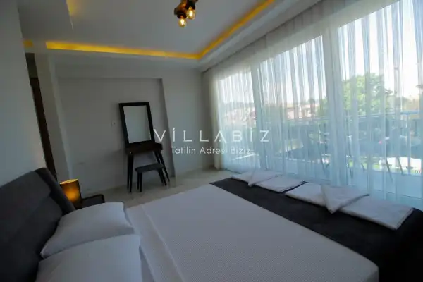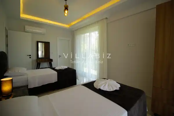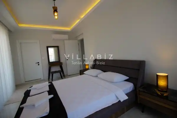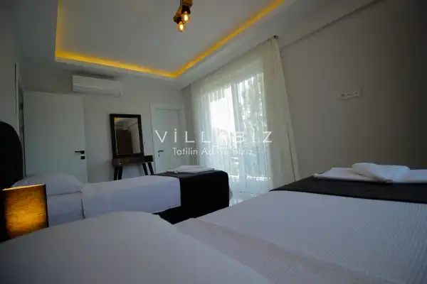 Maksimum 8 kişinin konaklayabileceği villamızın toplam 4 adet yatak odasının 2 tanesinde 1'er adet çift kişilik yatak, 2 tanesinde ise birleştirilebilen 2 adet tek kişilik yatak bulunmaktadır. Villamızın tüm yatak odalarında ebeveyn banyoları ve klima bulunmaktadır. Salonda klima ve Smart TV bulunmakta olup 250 metrekare geniş iç alanı ile villamız oldukça geniş ve ferahtır.