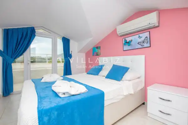 Toplam 4 yatak odasından oluşmuş, 8 kişi konaklama kapasitesine sahiptir. Geniş aileler ve kalabalık arkadaş grupları için oldukça idealdir. Oldukça şık ve modern bir şekilde döşenmiş olan villamızda misafirlerimiz için herşey düşünülmüştür. Havuz terasında bulunan şezlonglarda güneşlenebilir, bahçe masasında muhteşem yemekler yiyebilir, salıncakta sallanıp keyifli dakikalar geçirebilirsiniz.