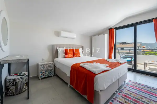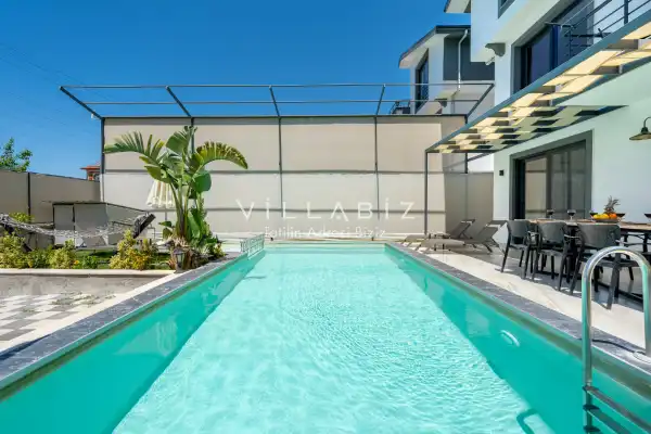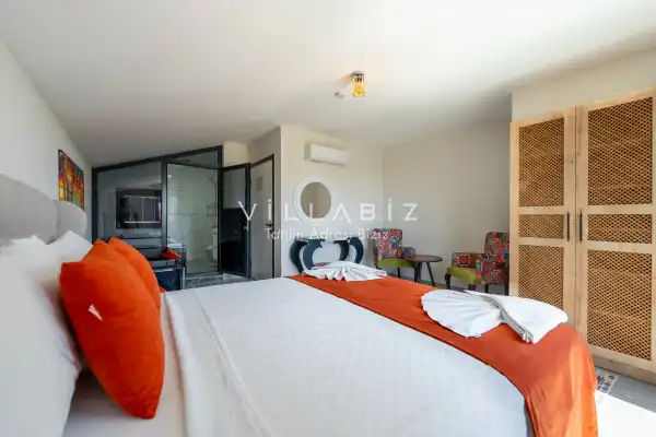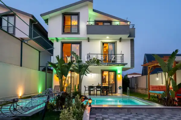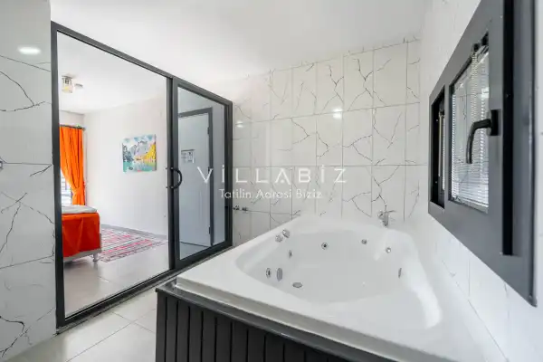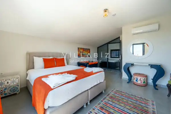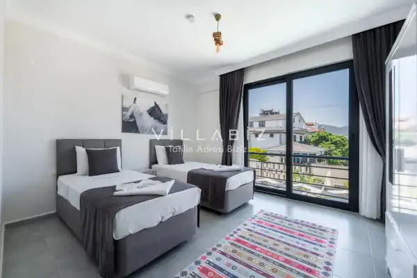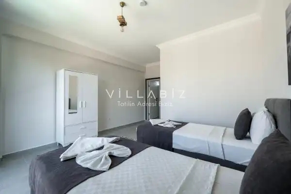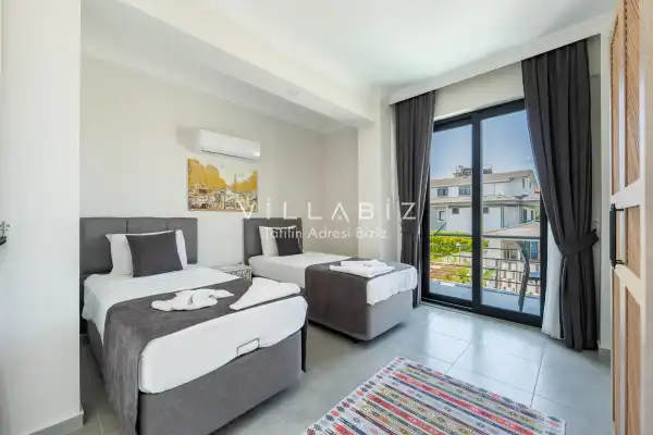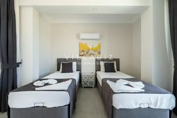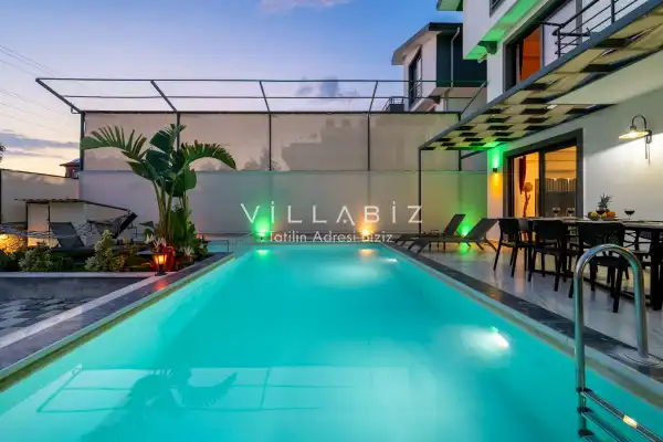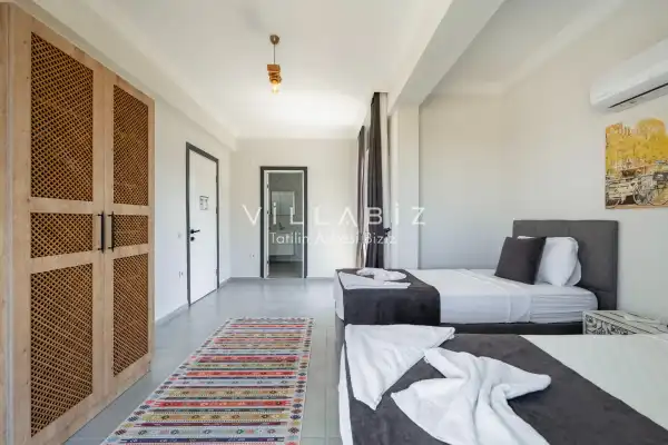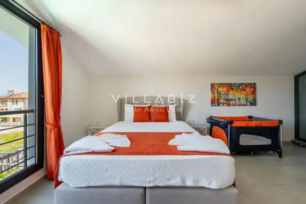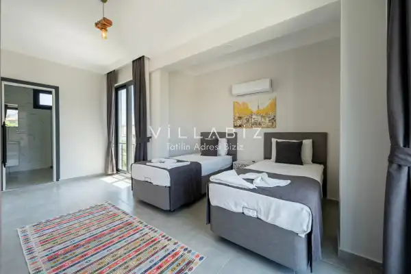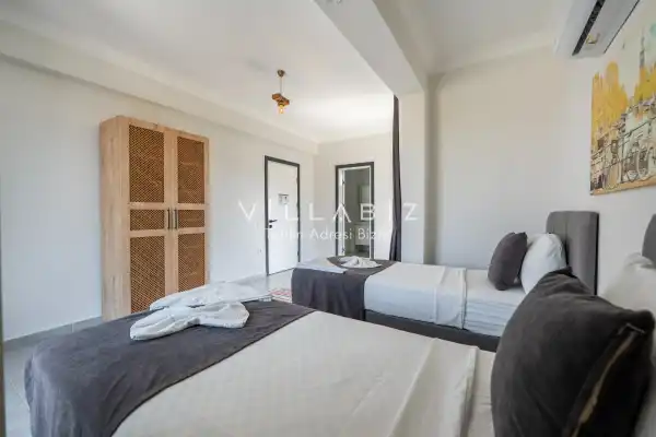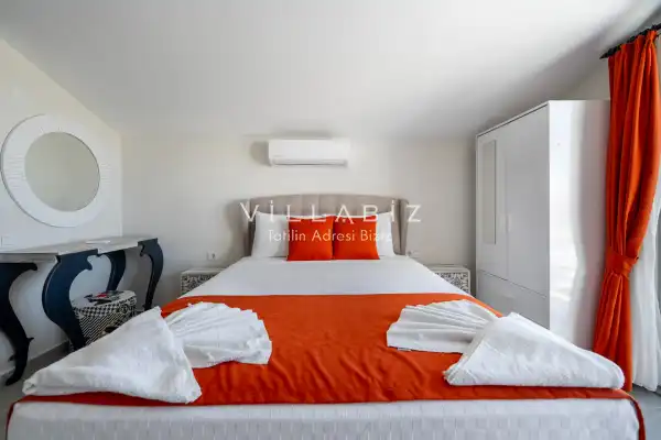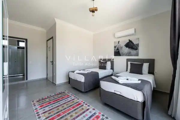 Toplam 4 yatak odasından oluşmuş, 8 kişi konaklama kapasitesine sahiptir. Geniş aileler ve kalabalık arkadaş grupları için oldukça idealdir. Oldukça şık ve modern bir şekilde döşenmiş olan villamızda misafirlerimiz için her şey düşünülmüştür. Havuz terasında bulunan şezlonglarda güneşlenebilir, bahçe masasında muhteşem yemekler yiyebilir, salıncakta sallanıp keyifli dakikalar geçirebilirsiniz.
