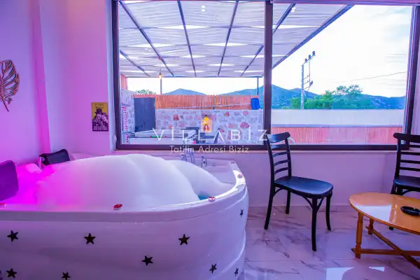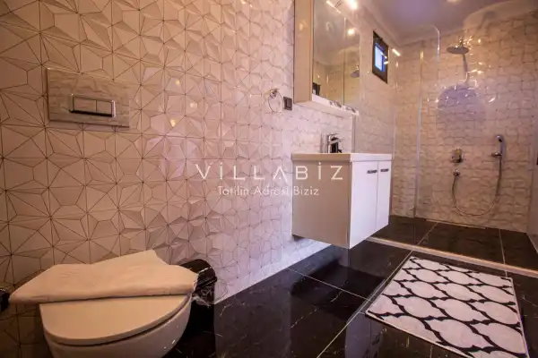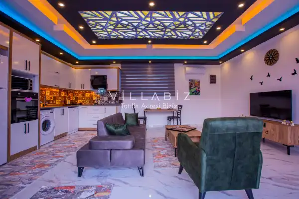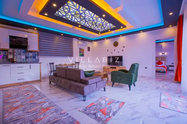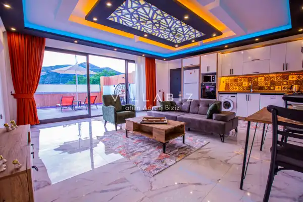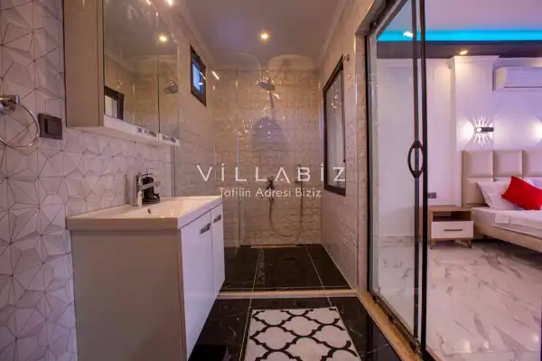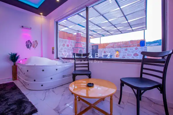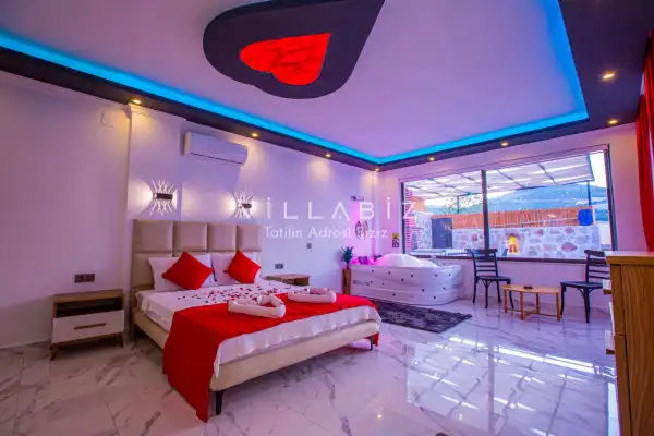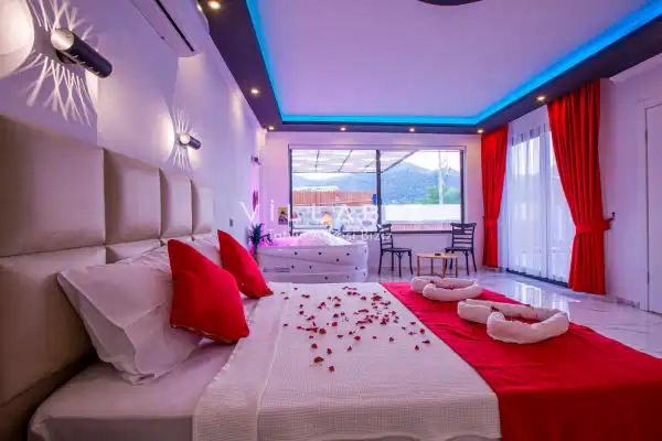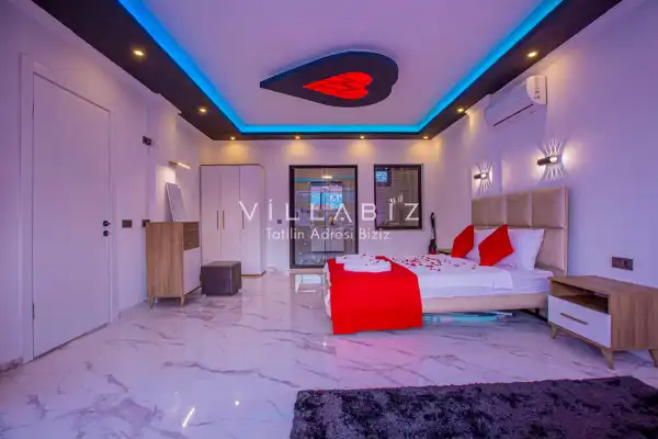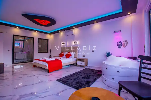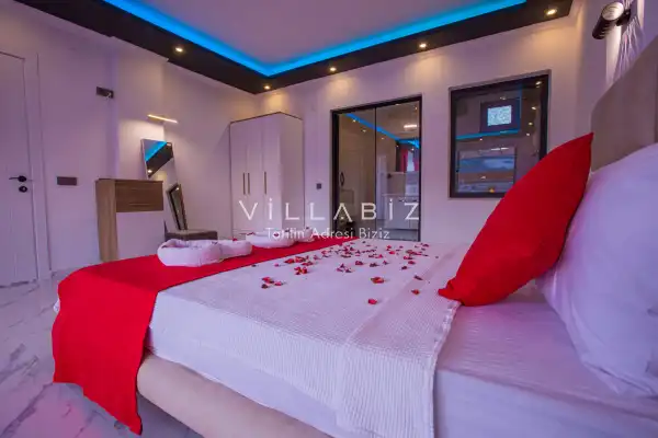 Villa 1 yatak odalı olup 2 kişilik konaklama kapasitesine sahiptir. 1. Yatak odasında konforlu bir çift kişilik yatak, klima, elbise dolabı, jakuzi ve ebeveyn banyosu bulunmaktadır. Salon bölümünde modern oturma grubu, televizyon, klima ve açık plan tam donanımlı mutfak yer almaktadır. Mutfakta buzdolabı, ocak, fırın, yemek takımları ve temel mutfak ekipmanları eksiksiz şekilde sunulmaktadır.