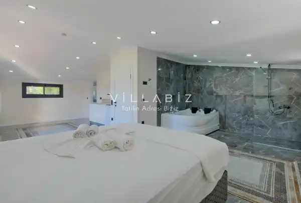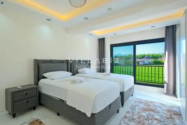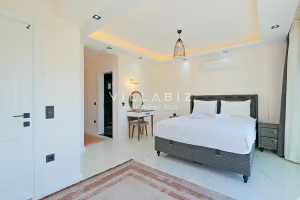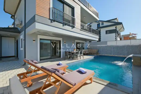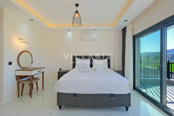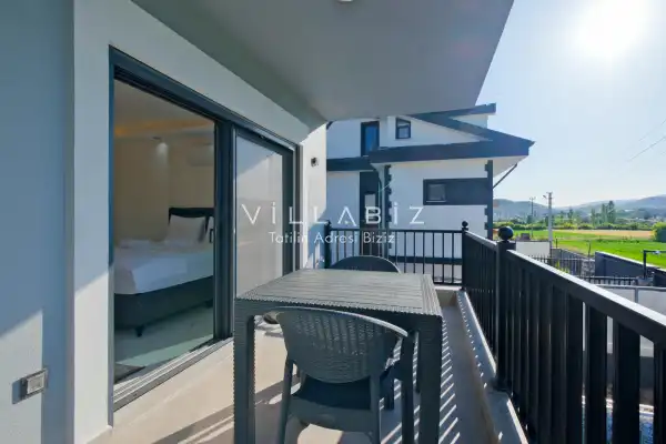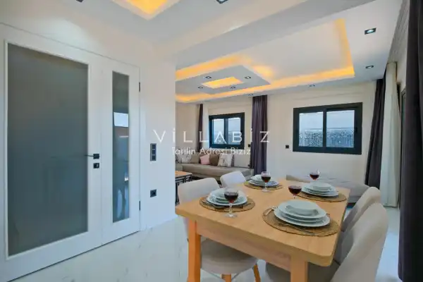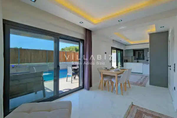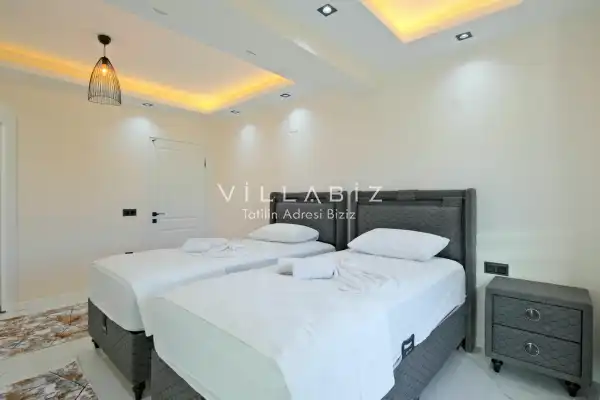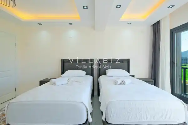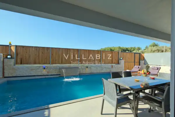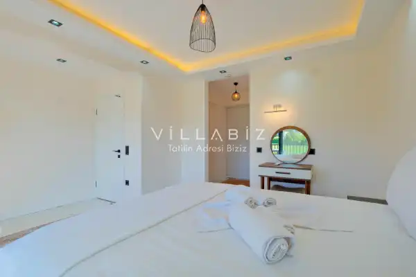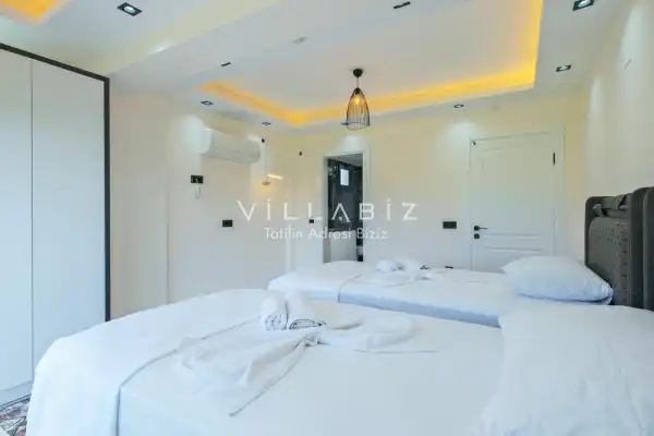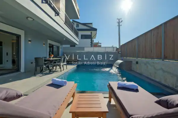 Toplam 3 yatak odasından oluşmuş, 6 kişi konaklama kapasitesine sahiptir. Geniş aileler ve kalabalık arkadaş grupları için oldukça idealdir. Oldukça şık ve modern bir şekilde döşenmiş olan villamızda misafirlerimiz için her şey düşünülmüştür. Havuz terasında bulunan şezlonglarda güneşlenebilir, bahçe masasında muhteşem yemekler yiyebilir, salıncakta sallanıp keyifli dakikalar geçirebilirsiniz.
