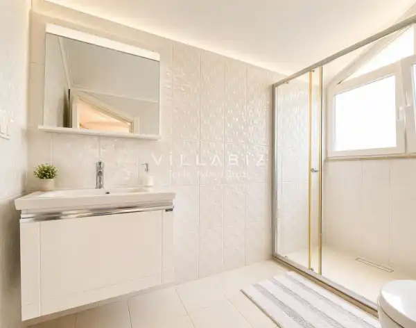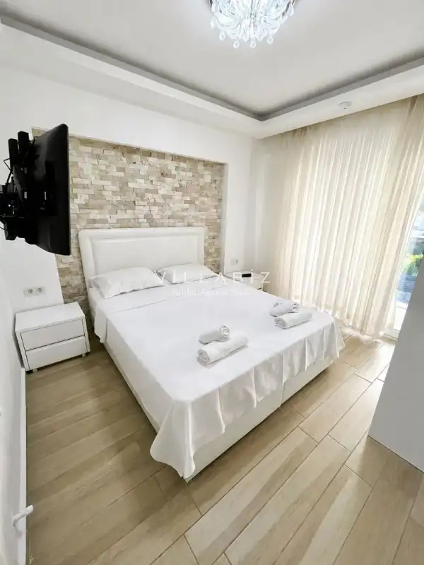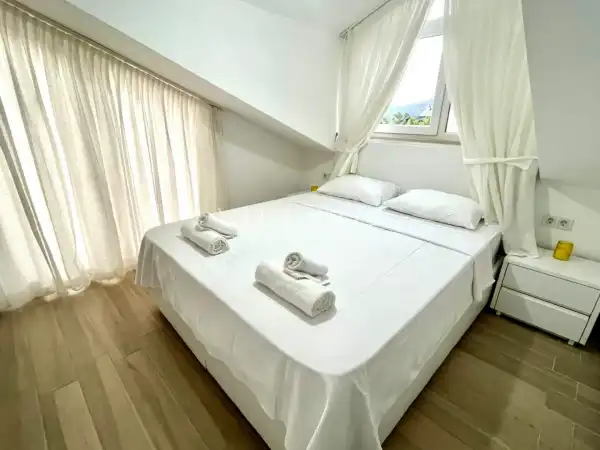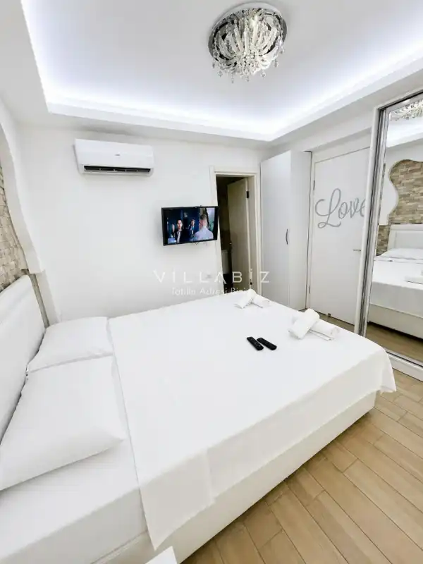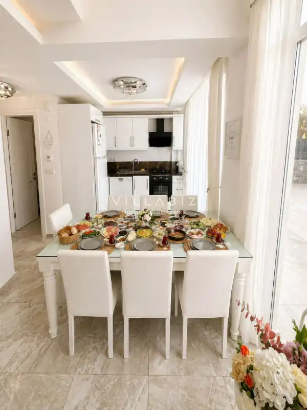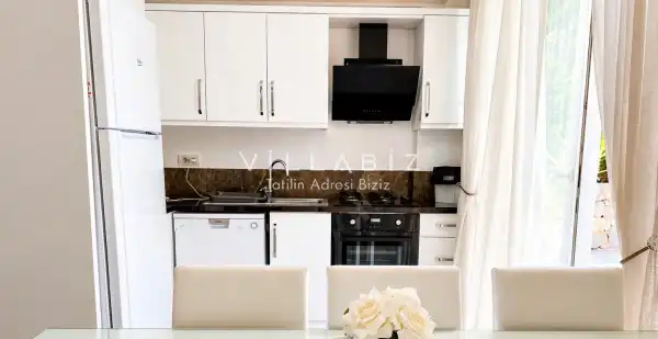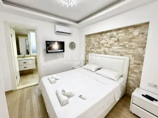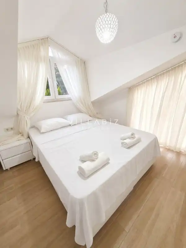 Villa 4 yatak odalı olup 8 kişilik konaklama kapasitesine sahiptir. 1. Yatak odasında konforlu çift kişilik yatak, klima, elbise dolabı ve ebeveyn banyosu; 2. Yatak odasında konforlu çift kişilik yatak, klima, elbise dolabı ve ebeveyn banyosu; 3. Yatak odasında konforlu çift kişilik yatak, klima, elbise dolabı ve ebeveyn banyosu; 4. Yatak odasında konforlu çift kişilik yatak, klima, elbise dolabı ve ebeveyn banyosu bulunmaktadır. Salon bölümünde modern oturma grubu, televizyon, klima ve açık plan tam donanımlı mutfak yer alır. Mutfakta buzdolabı, ocak, fırın, bulaşık makinesi, yemek takımları ve ihtiyaç duyulan tüm temel mutfak ekipmanları eksiksiz şekilde sunulmaktadır.