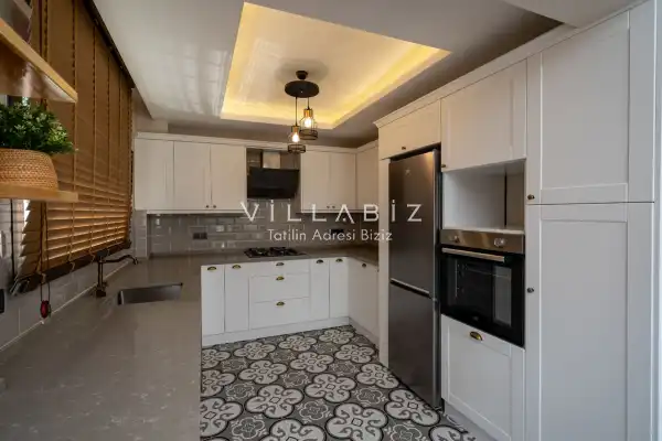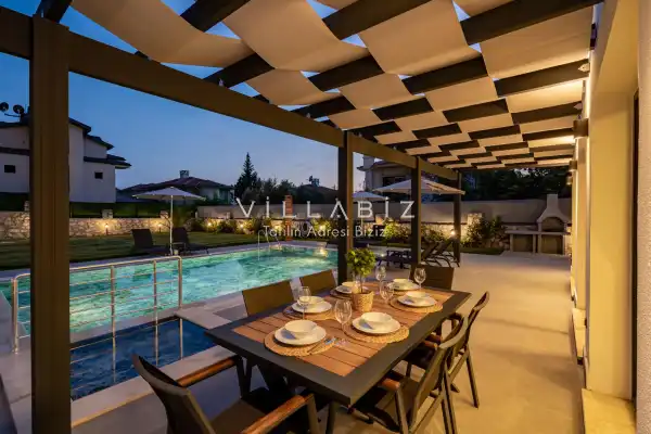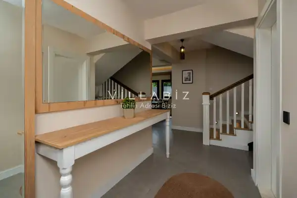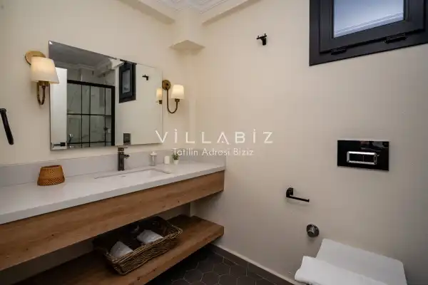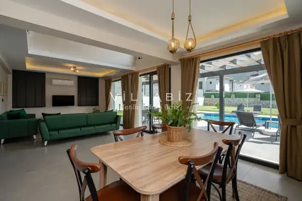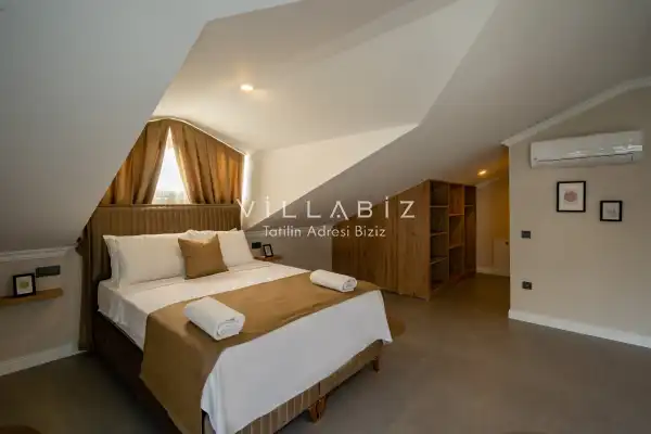 Toplam 3 yatak odasından oluşmuş, 6 kişi konaklama kapasitesine sahiptir. Geniş aileler ve kalabalık arkadaş grupları için oldukça idealdir. Oldukça şık ve modern bir şekilde döşenmiş olan villamızda misafirlerimiz için herşey düşünülmüştür. Havuz terasında bulunan şezlonglarda güneşlenebilir, bahçe masasında muhteşem yemekler yiyebilir, salıncakta sallanıp keyifli dakikalar geçirebilirsiniz.
