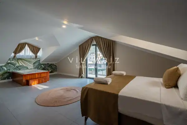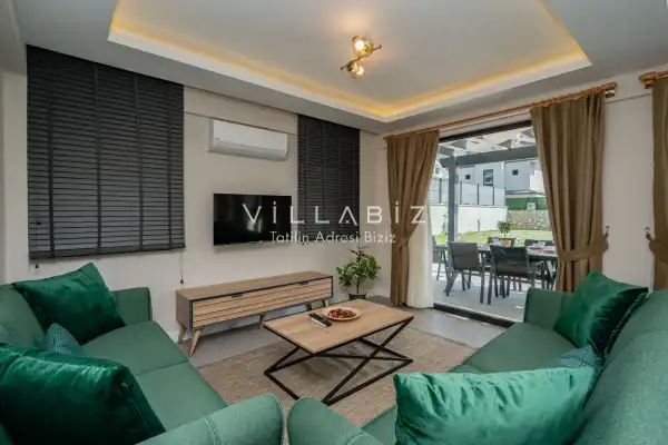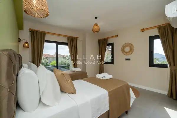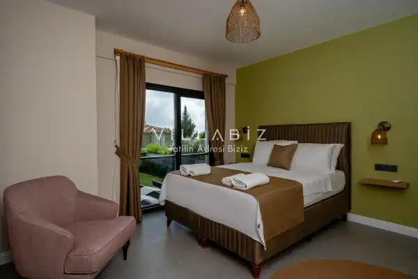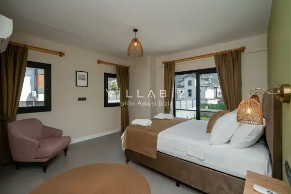 Toplam 3 yatak odasından oluşmuş, 6 kişi konaklama kapasitesine sahiptir. Geniş aileler ve kalabalık arkadaş grupları için oldukça idealdir. Oldukça şık ve modern bir şekilde döşenmiş olan villamızda misafirlerimiz için herşey düşünülmüştür. Havuz terasında bulunan şezlonglarda güneşlenebilir, bahçe masasında muhteşem yemekler yiyebilir, salıncakta sallanıp keyifli dakikalar geçirebilirsiniz.
