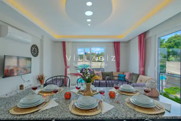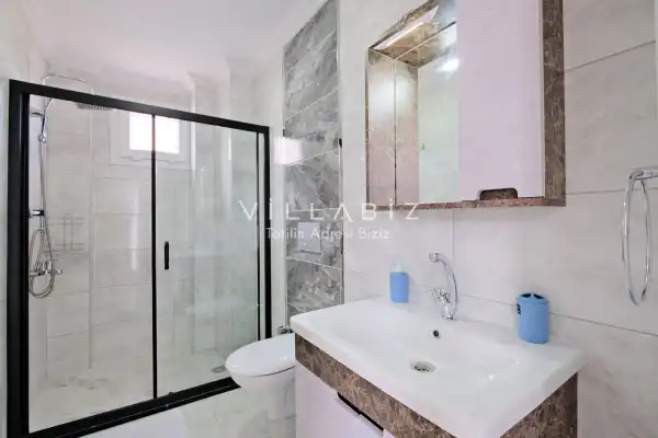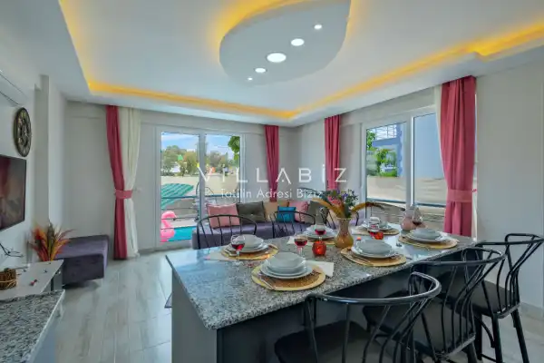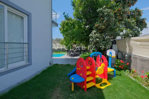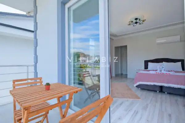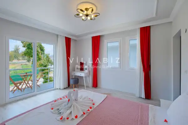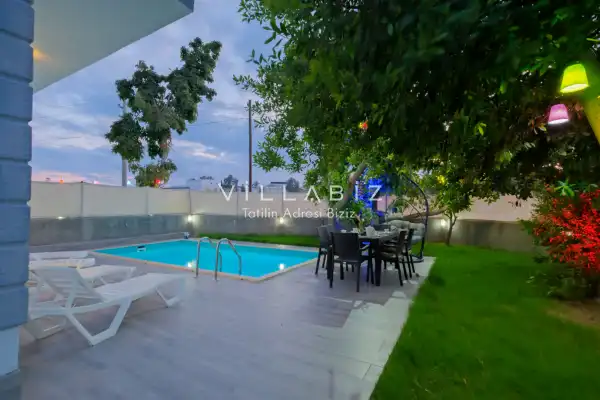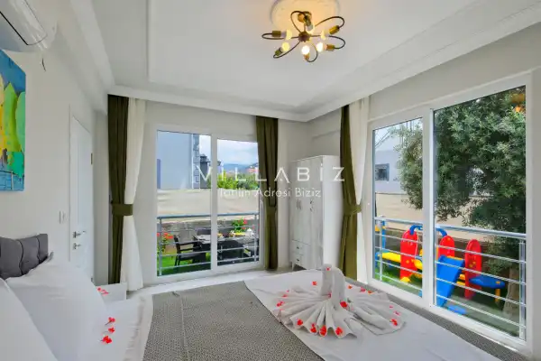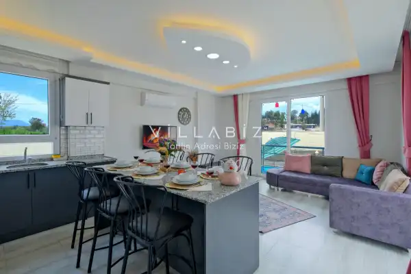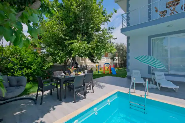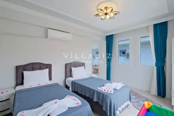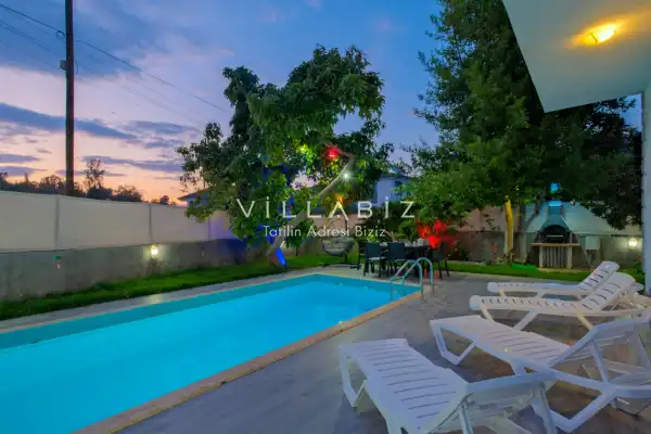 Toplam 3 yatak odasından oluşmuş, 6 kişi konaklama kapasitesine sahiptir. Geniş aileler ve kalabalık arkadaş grupları için oldukça idealdir. Oldukça şık ve modern bir şekilde döşenmiş olan villamızda misafirlerimiz için her şey düşünülmüştür. Havuz terasında bulunan şezlonglarda güneşlenebilir, bahçe masasında muhteşem yemekler yiyebilir, salıncakta sallanıp keyifli dakikalar geçirebilirsiniz.