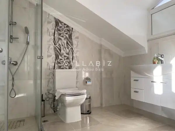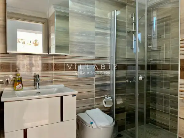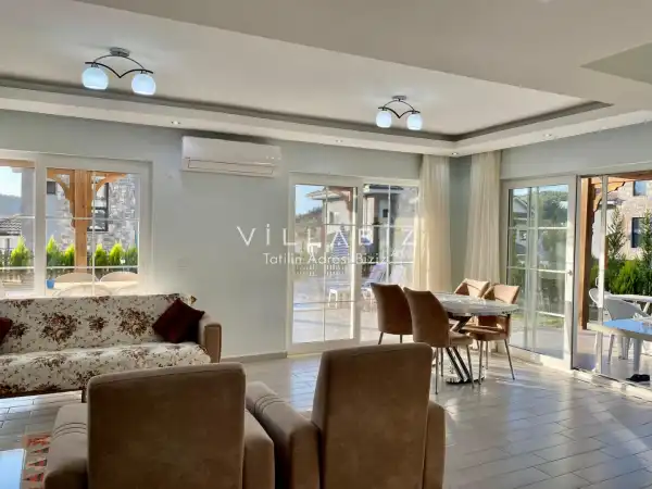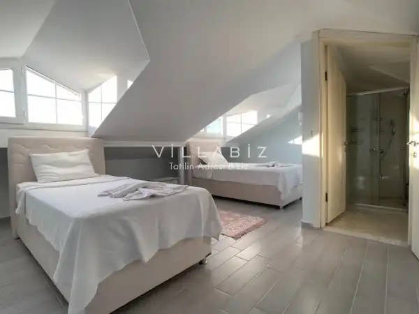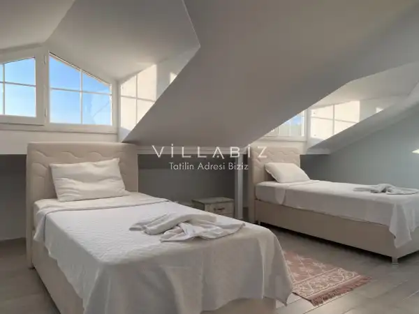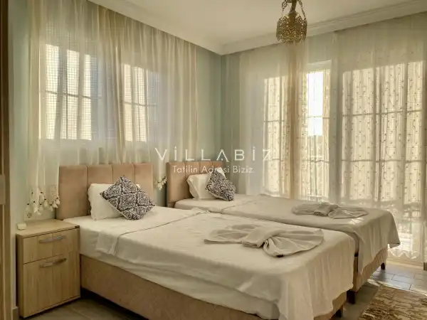 Toplam 3 yatak odasından oluşmuş, 6 kişi konaklama kapasitesine sahiptir. Geniş aileler ve kalabalık arkadaş grupları için oldukça idealdir. Oldukça şık ve modern bir şekilde döşenmiş olan villamızda misafirlerimiz için herşey düşünülmüştür. Havuz terasında bulunan şezlonglarda güneşlenebilir, bahçe masasında muhteşem yemekler yiyebilir, salıncakta sallanıp keyifli dakikalar geçirebilirsiniz.