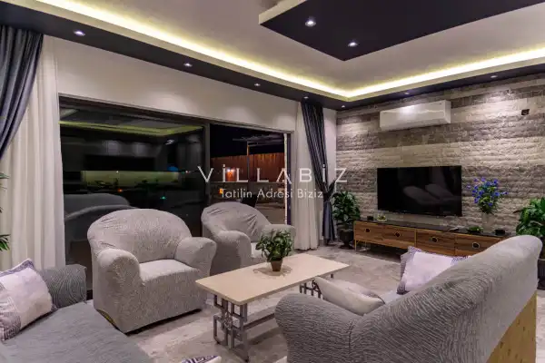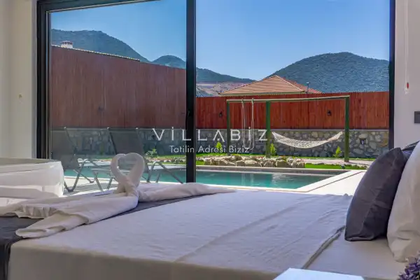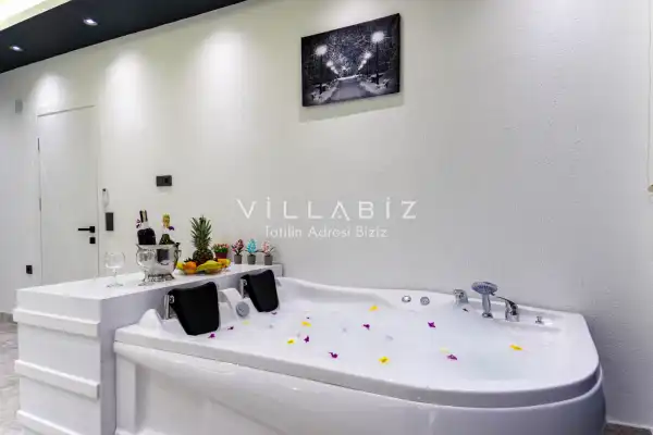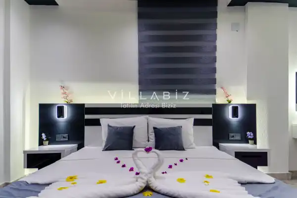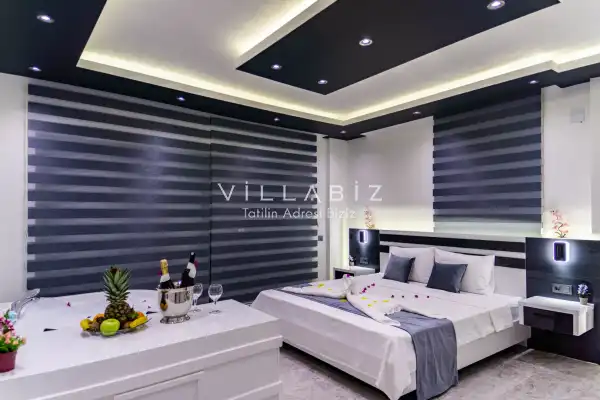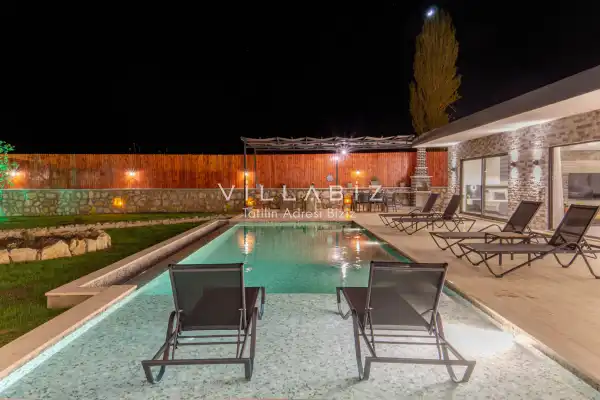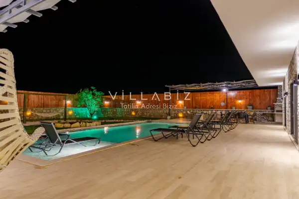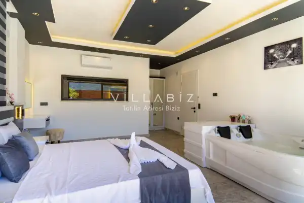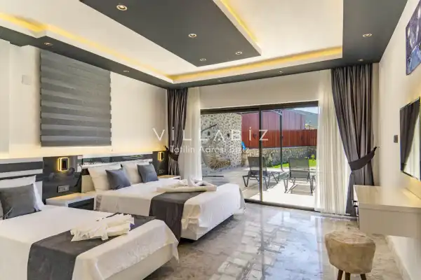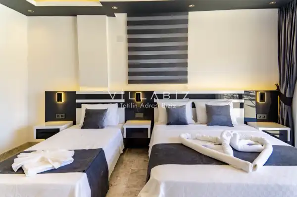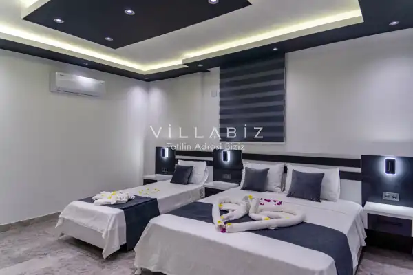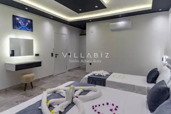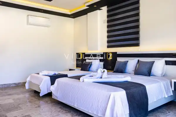 Toplam 2 yatak odasından oluşmuş, 5 kişi konaklama kapasitesine sahiptir. Geniş aileler ve kalabalık arkadaş grupları için oldukça idealdir. Oldukça şık ve modern bir şekilde döşenmiş olan villamızda misafirlerimiz için herşey düşünülmüştür. Havuz terasında bulunan şezlonglarda güneşlenebilir, bahçe masasında muhteşem yemekler yiyebilir, salıncakta sallanıp keyifli dakikalar geçirebilirsiniz.
