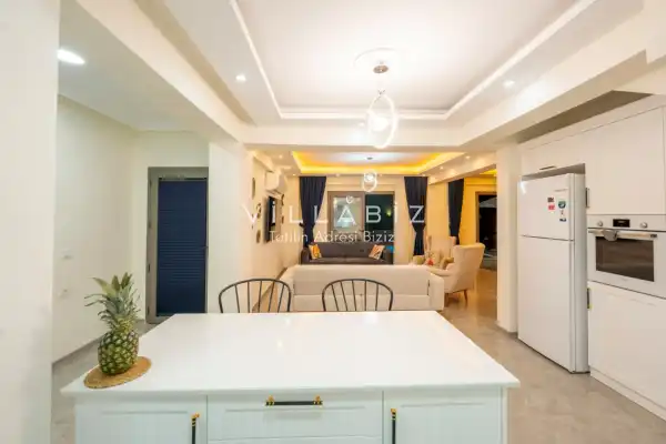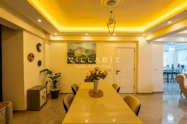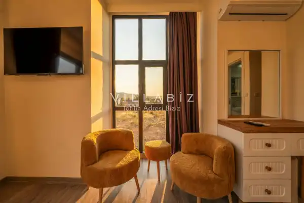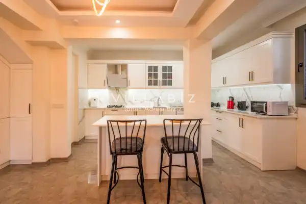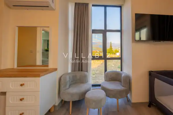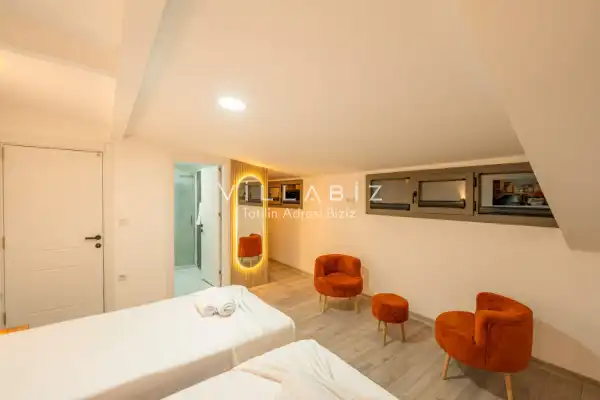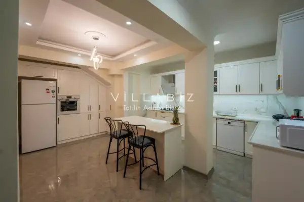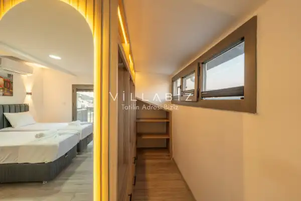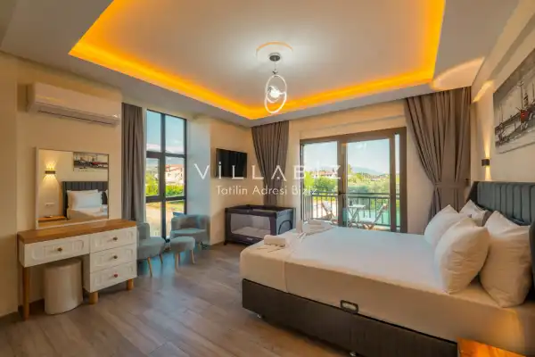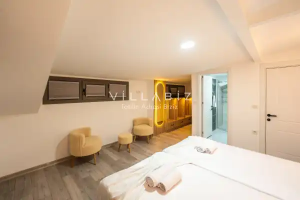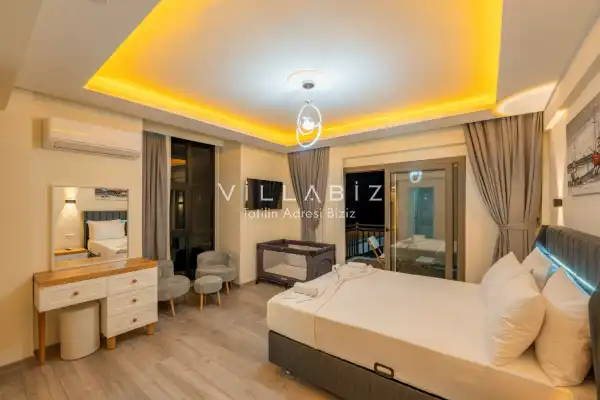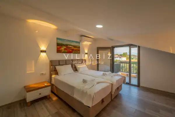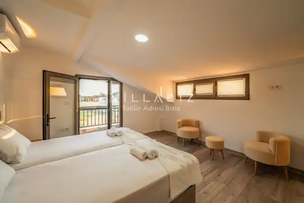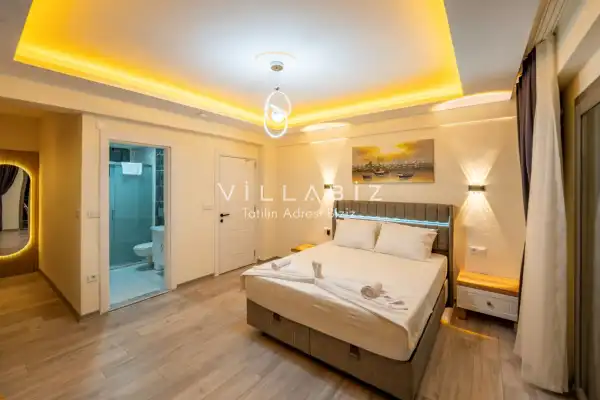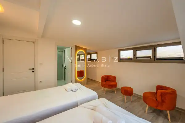 Toplam 4 yatak odasından oluşmuş, 8 kişi konaklama kapasitesine sahiptir. Geniş aileler ve kalabalık arkadaş grupları için oldukça idealdir. Oldukça şık ve modern bir şekilde döşenmiş olan villamızda misafirlerimiz için her şey düşünülmüştür. Havuz terasında bulunan şezlonglarda güneşlenebilir, bahçe masasında muhteşem yemekler yiyebilir, keyifli dakikalar geçirebilirsiniz.