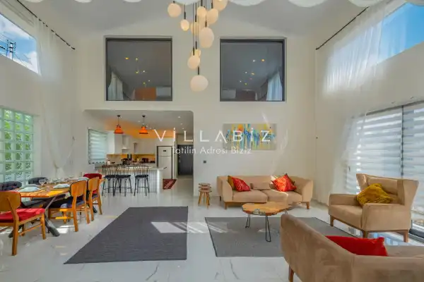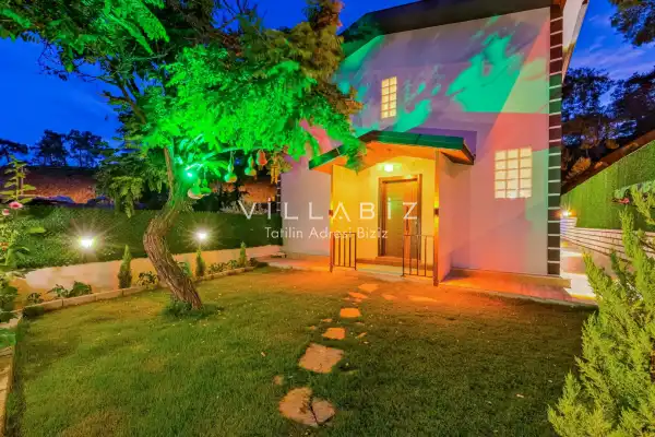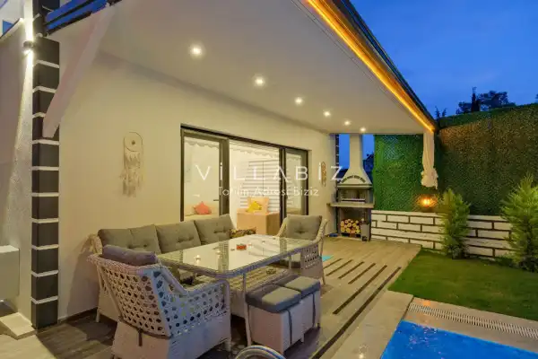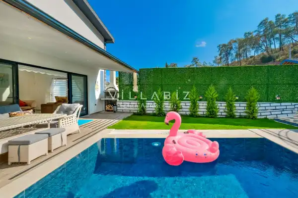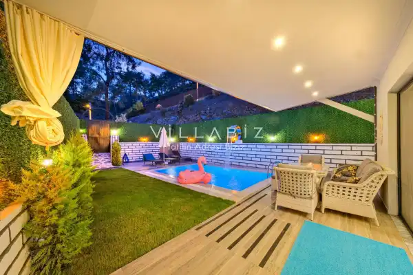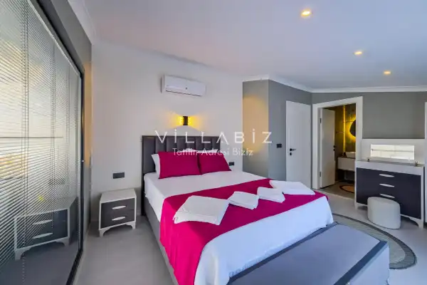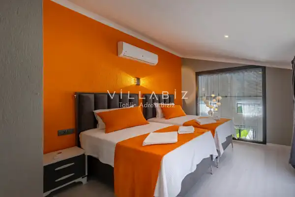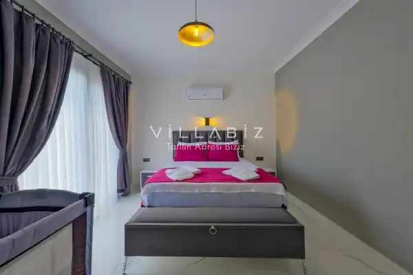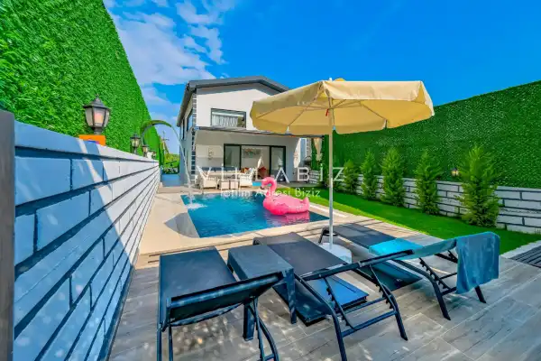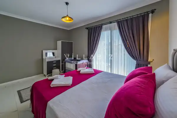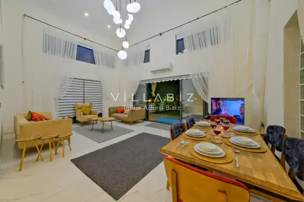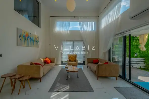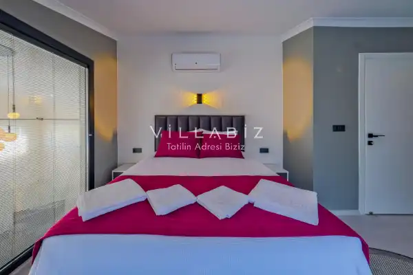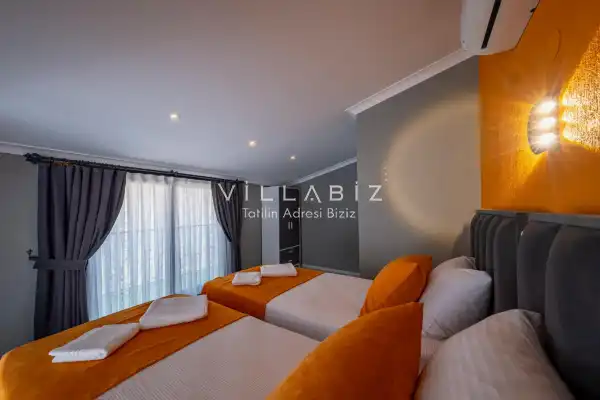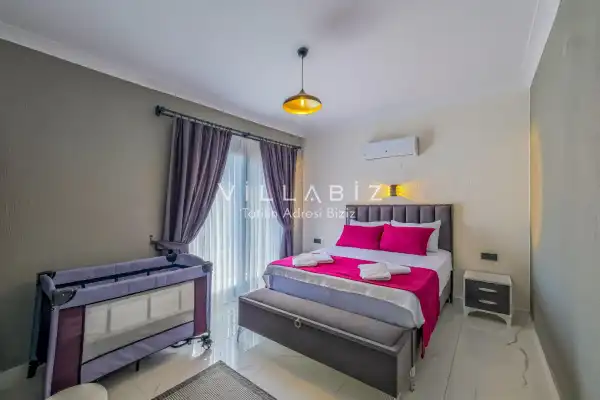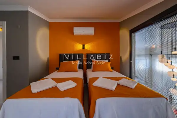 Toplam 3 yatak odasından oluşmuş, 6 kişi konaklama kapasitesine sahiptir. Geniş aileler ve kalabalık arkadaş grupları için oldukça idealdir. Oldukça şık ve modern bir şekilde döşenmiş olan villamızda misafirlerimiz için her şey düşünülmüştür. Havuz terasında bulunan şezlonglarda güneşlenebilir, bahçe masasında muhteşem yemekler yiyebilir, salıncakta sallanıp keyifli dakikalar geçirebilirsiniz.