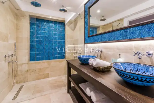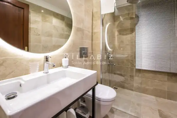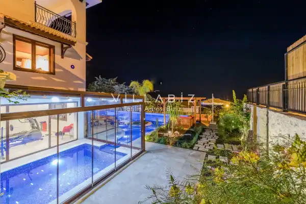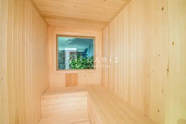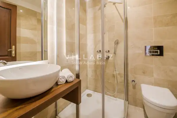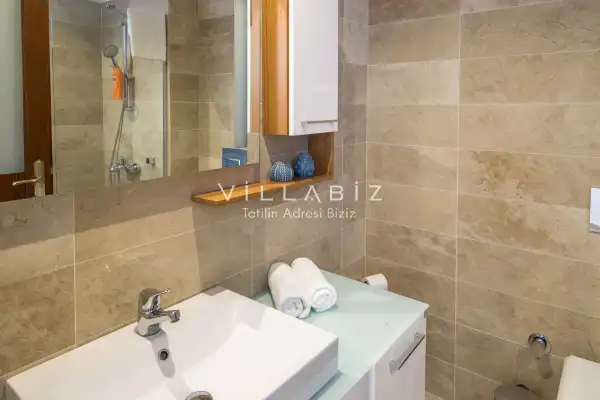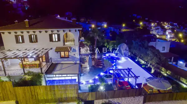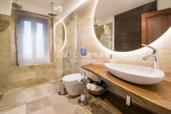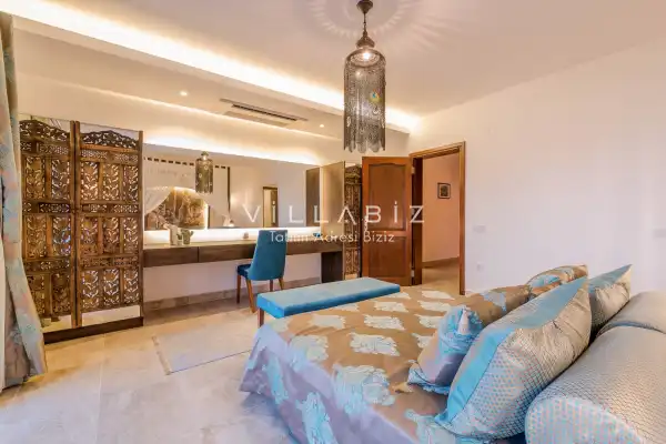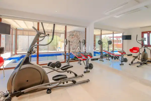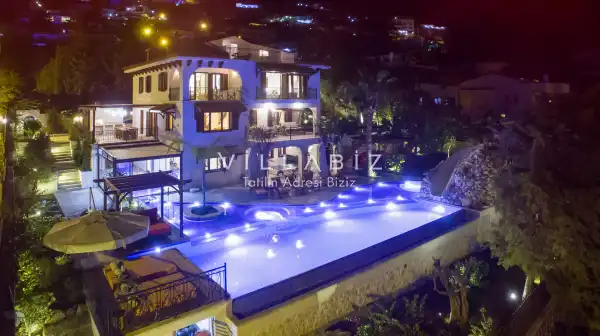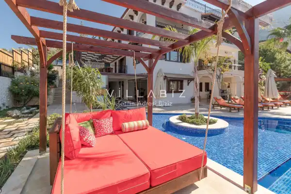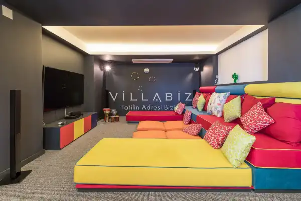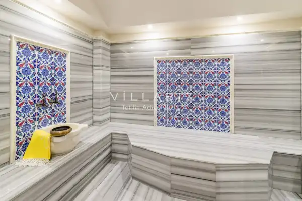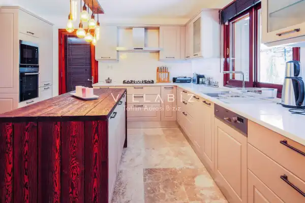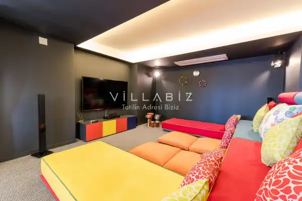 Villanın 6 adet  banyosu ve jakuzisi sauna ve hamamı mevcut. Açık mutfağı ve kendine ait bahçesinde bir havuzu var. Mutfağında bulaşık makinesi, buzdolabı, ankastre fırın, tost makinesi ve mutfakta ihtiyaç olan hemen hemen bütün gereçler bulunuyor. Barbekü, masa, sandalyeler, şezlonglar ve şemsiyeler bahçe keyfini sınırsız yaşamanıza imkan tanıyor. Salonunda oturma grubu, televizyon, eşyalar bulunurken, tüm odalar için ayrı klima imkanı var.