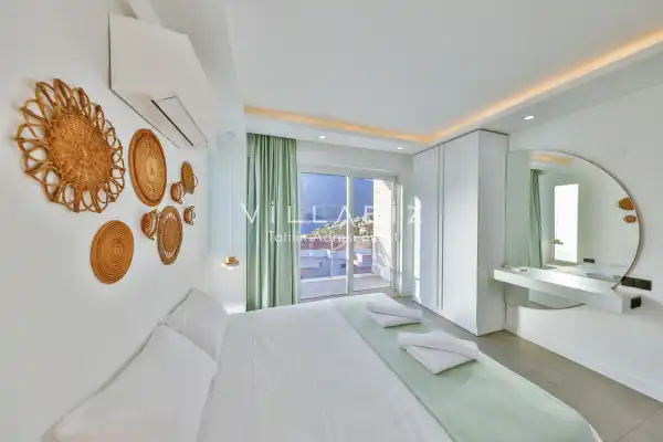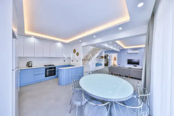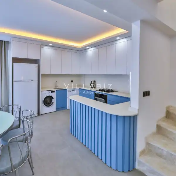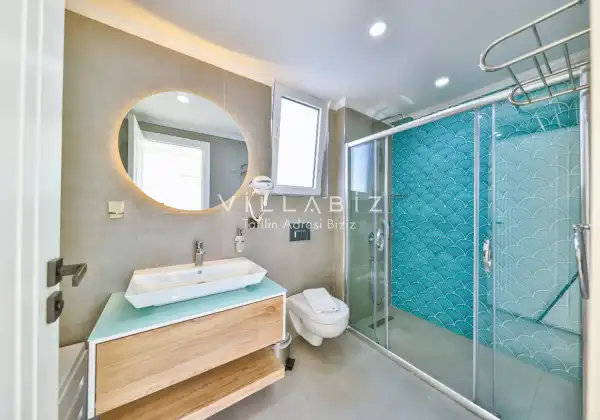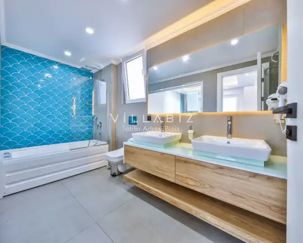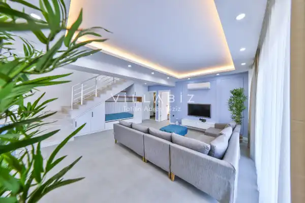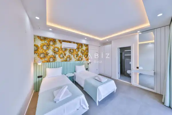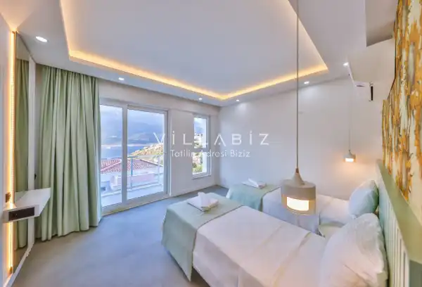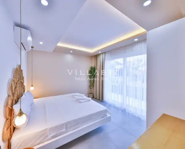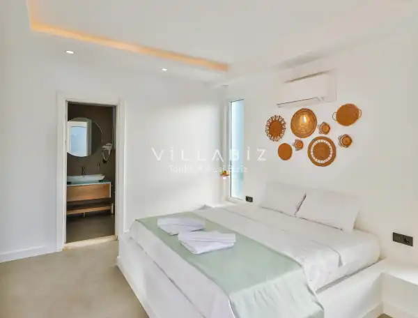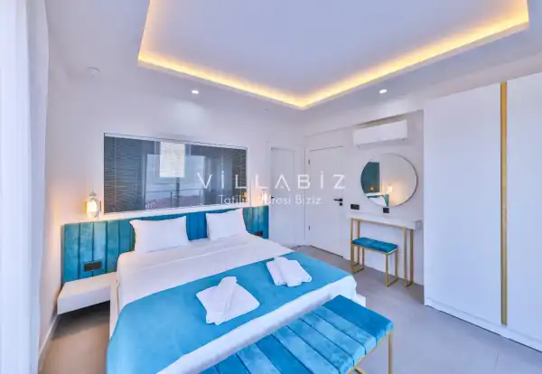 Villa 4 yatak odalı olup 8 kişilik konaklama kapasitesine sahiptir. 1. Yatak odasında konforlu bir çift kişilik yatak, klima, elbise dolabı, jakuzi ve ebeveyn banyosu; 2. Yatak odasında konforlu bir çift kişilik yatak, klima, elbise dolabı, jakuzi ve ebeveyn banyosu; 3. Yatak odasında konforlu bir çift kişilik yatak, klima, elbise dolabı ve ebeveyn banyosu; 4.Yatak odasında konforlu iki tek kişilik yatak, klima, elbise dolabı ve ebeveyn banyosu bulunmaktadır. Salon bölümünde modern oturma grubu, televizyon, klima ve açık plan tam donanımlı mutfak yer almaktadır. Mutfakta buzdolabı, ocak, fırın, yemek takımları ve temel mutfak ekipmanları eksiksiz şekilde sunulmaktadır.