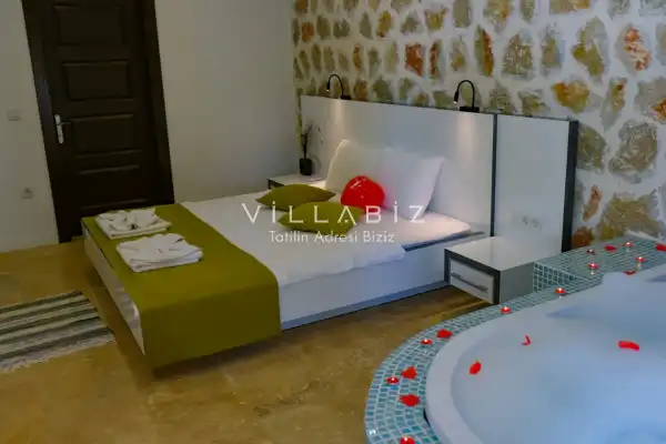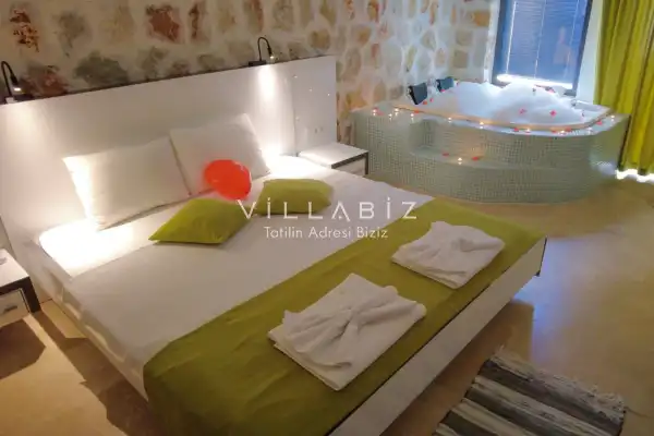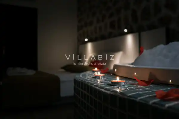 Villamız Antalya'nın en sakin ve Akdeniz koylarının masmavi büyüleyiciliğine sahip bölgesi Kalkan'ın Üzümlü mevkiinde yer almaktadır. Etrafını saran çam ve sedir ormanlarının, kusursuz maki iklimiyle birleştiği; sonunun hep sonsuz maviliklere eriştiği konumuyla kusursuz bir tatil isteyen balayı çiftlerimizin her anını özel ve unutulmaz kılmaktadır. Patara plajı, Kaputaş Plajı, Saklıkent Kanyonu, Gizlikent Şelalesi gibi turistik alanlara yakınlığıyla da trafiğe takılmadan etrafı keşfedecekleri bir tatil imkanı sunmaktadır.