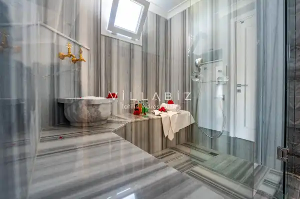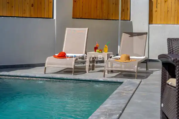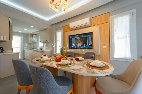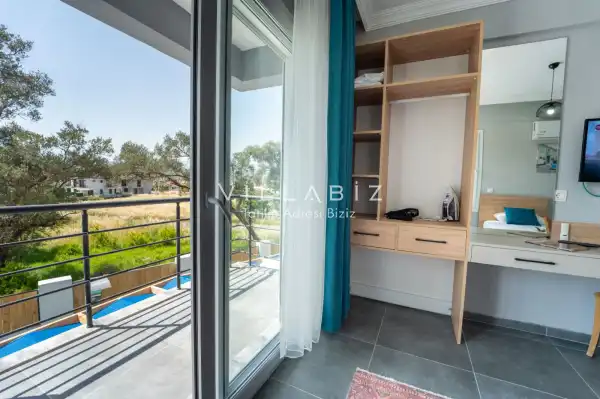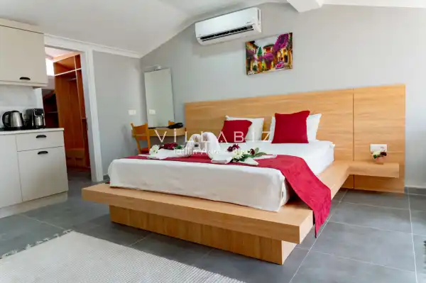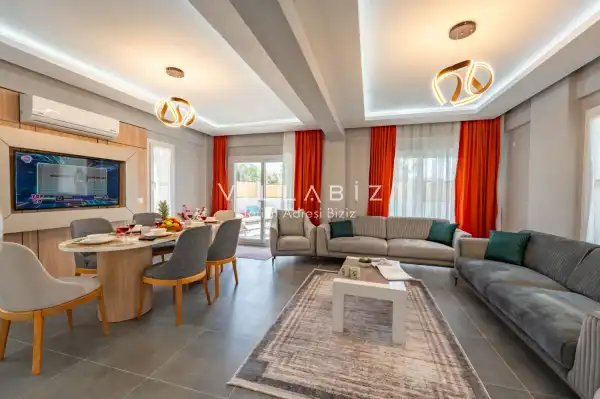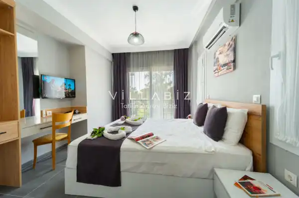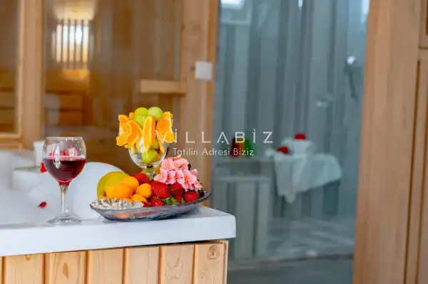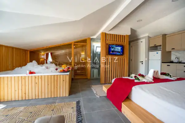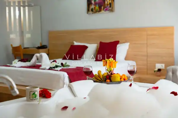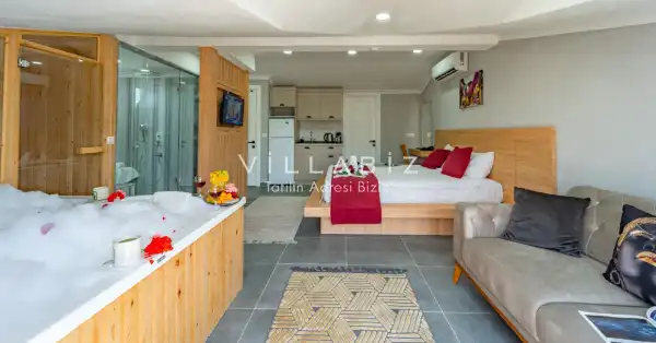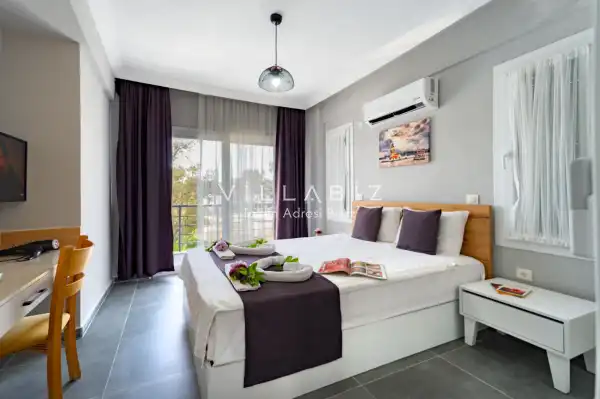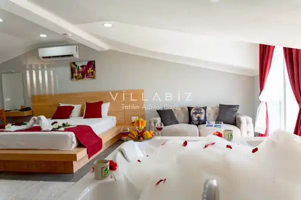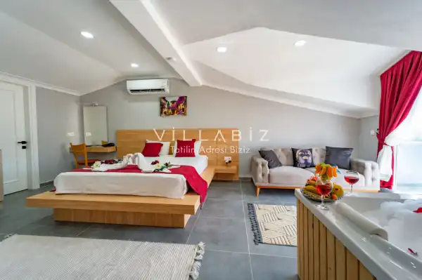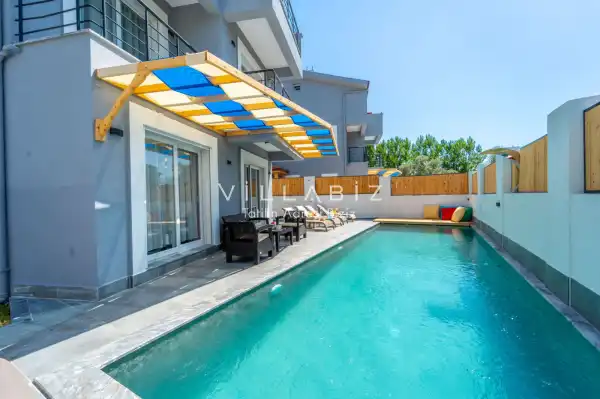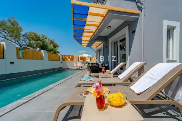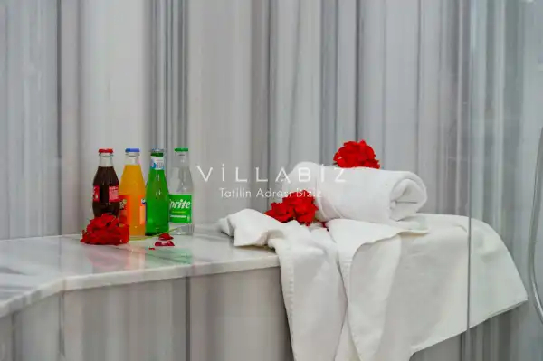 Toplam 3 yatak odasından oluşmuş, 6 kişi konaklama kapasitesine sahiptir. Geniş aileler ve kalabalık arkadaş grupları için oldukça idealdir. Oldukça şık ve modern bir şekilde döşenmiş olan villamızda misafirlerimiz için her şey düşünülmüştür. Havuz terasında bulunan şezlonglarda güneşlenebilir, bahçe masasında muhteşem yemekler yiyebilir, salıncakta sallanıp keyifli dakikalar geçirebilirsiniz.