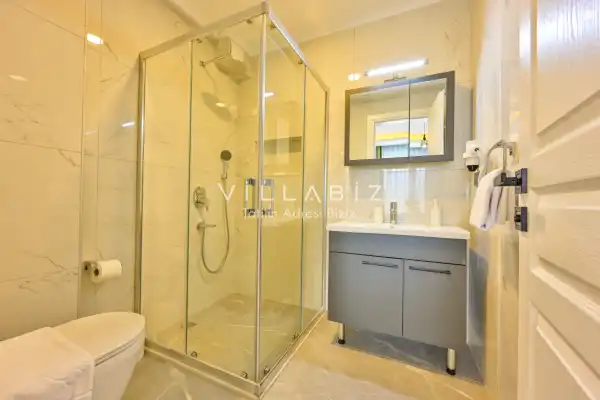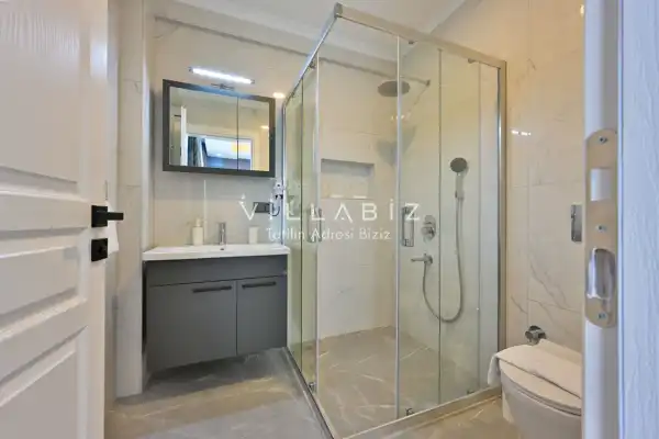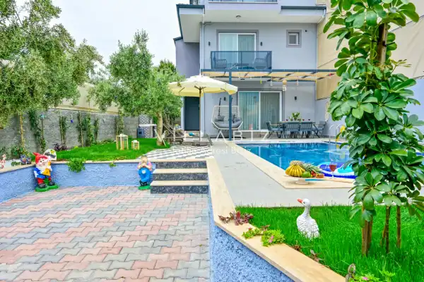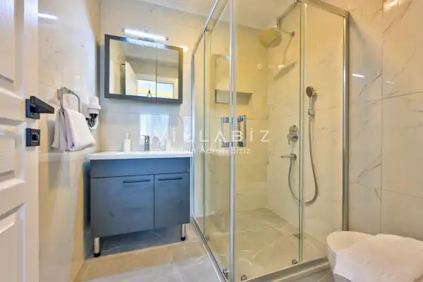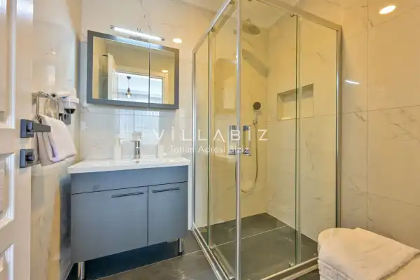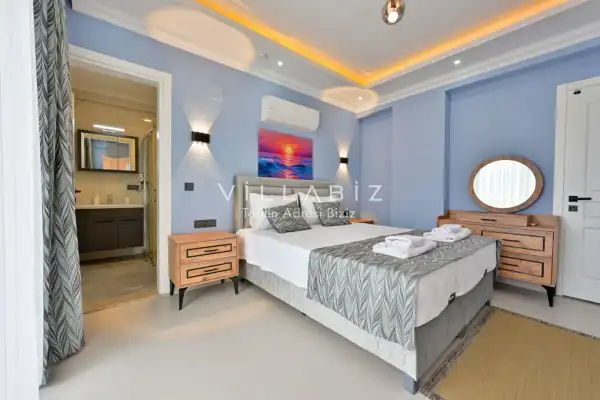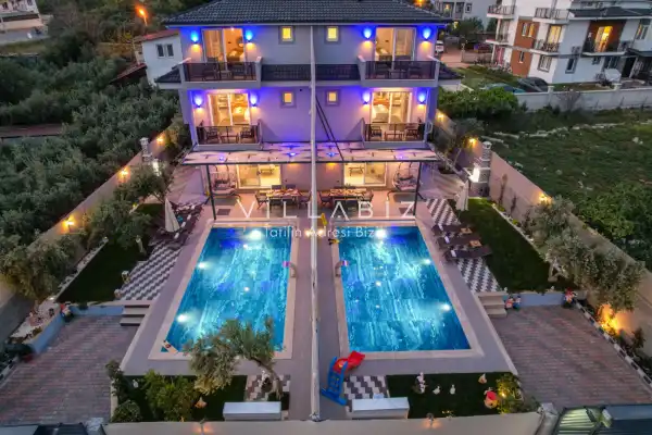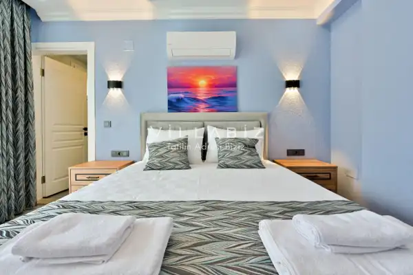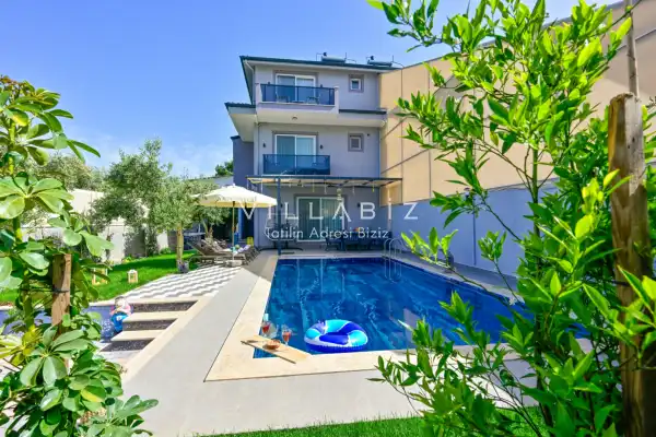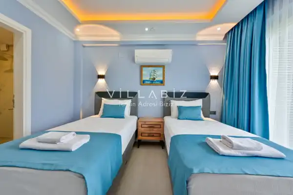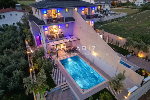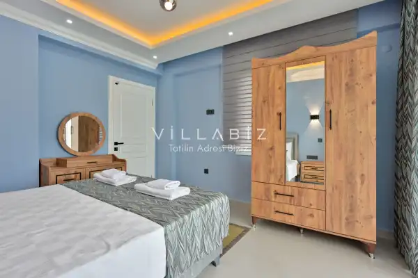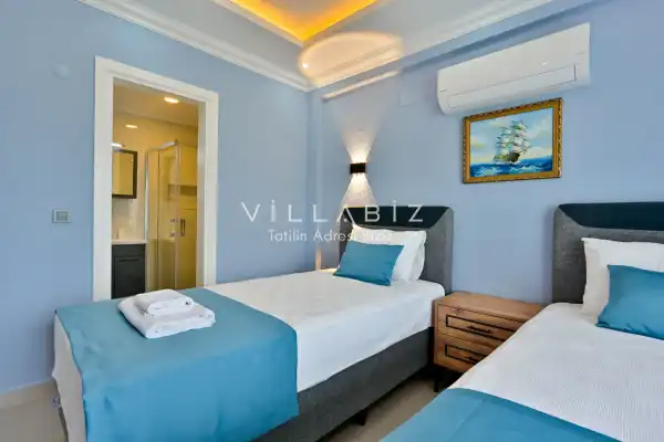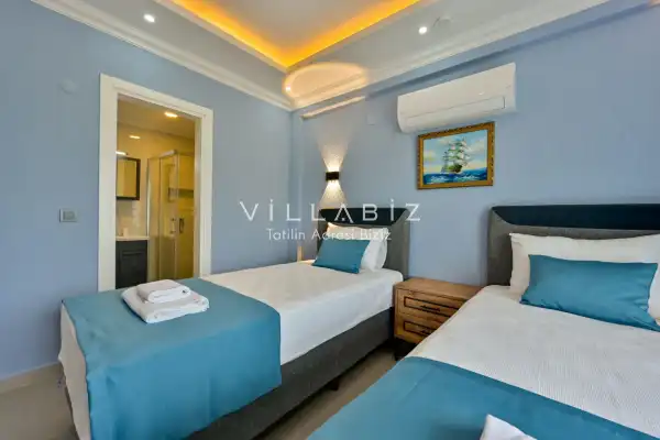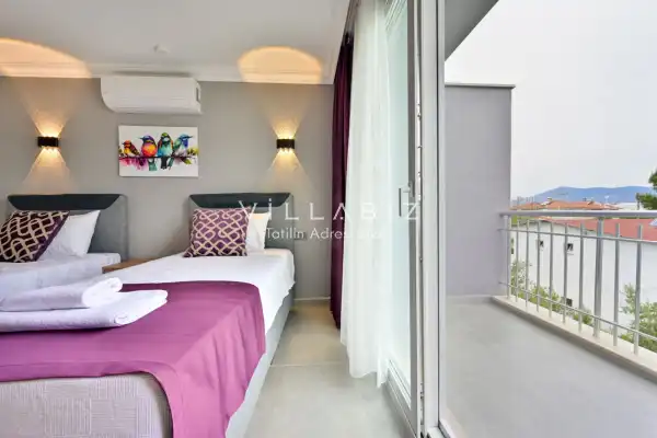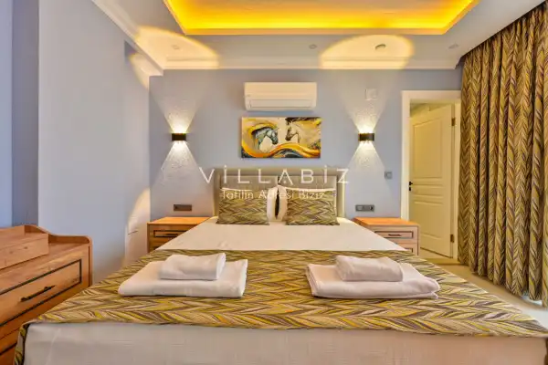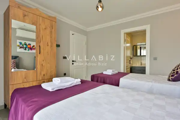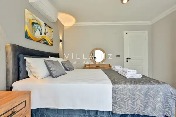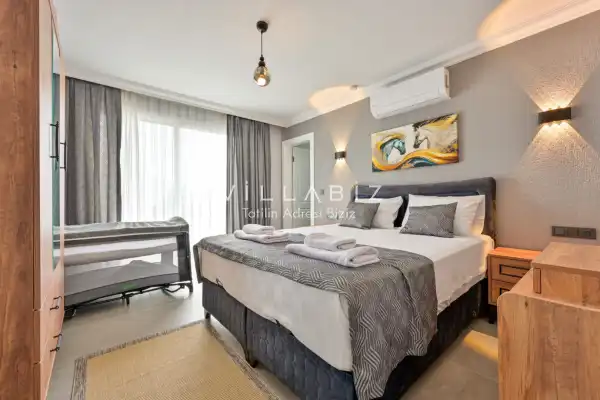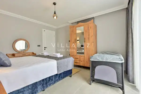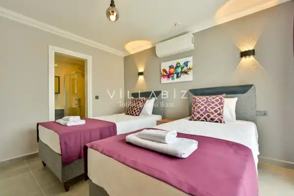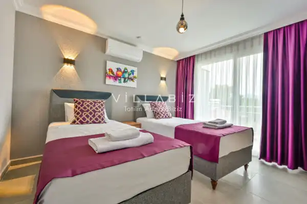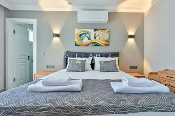 Toplam 4 yatak odasından oluşmuş, 8 kişi konaklama kapasitesine sahiptir. Geniş aileler ve kalabalık arkadaş grupları için oldukça idealdir. Oldukça şık ve modern bir şekilde döşenmiş olan villamızda misafirlerimiz için her şey düşünülmüştür. Havuz terasında bulunan şezlonglarda güneşlenebilir, bahçe masasında muhteşem yemekler yiyebilir, salıncakta sallanıp keyifli dakikalar geçirebilirsiniz.