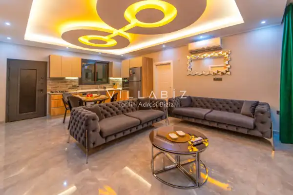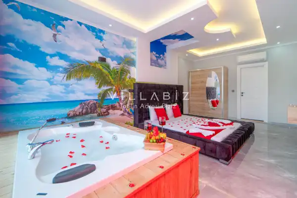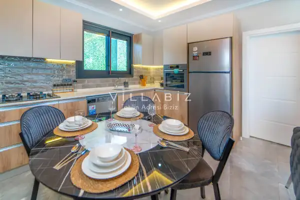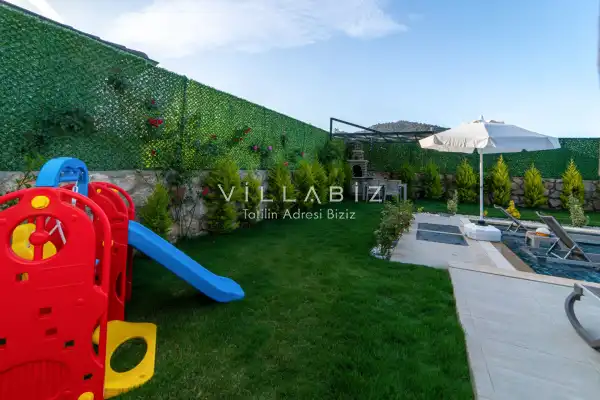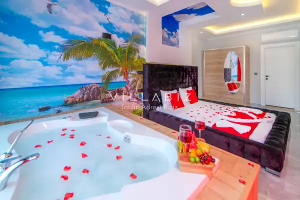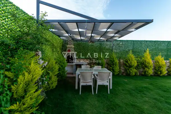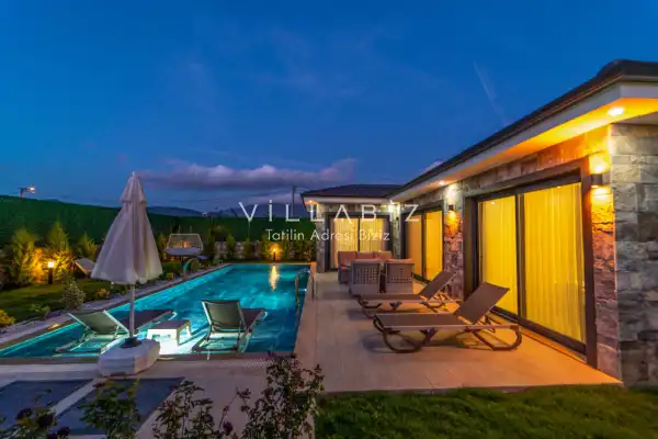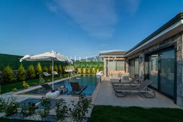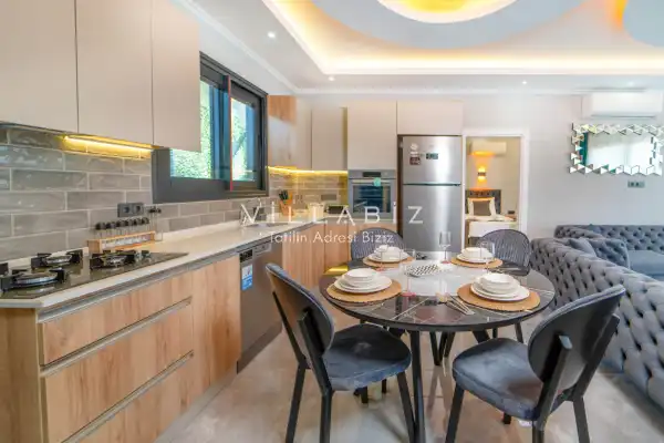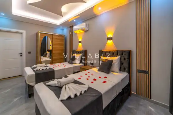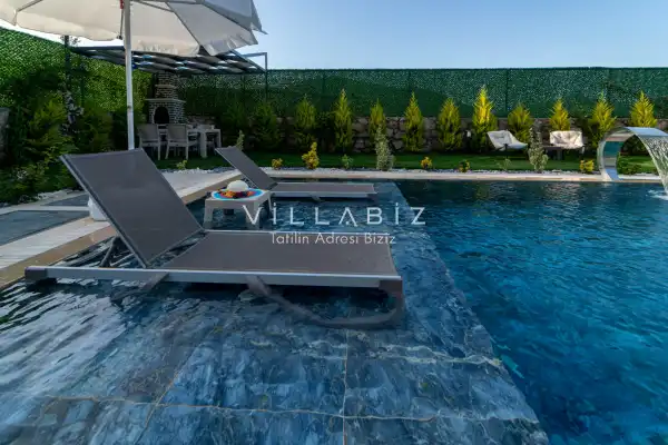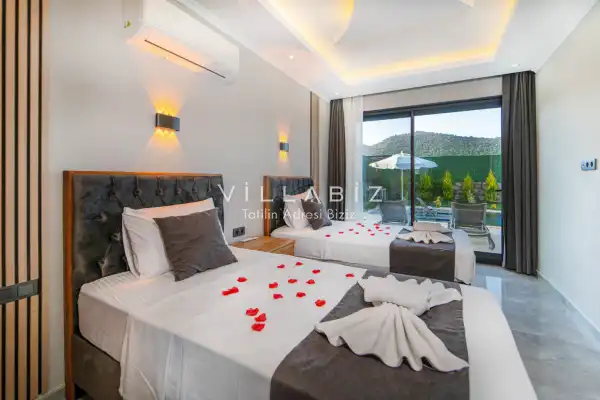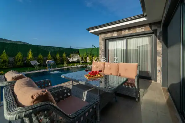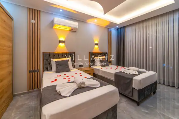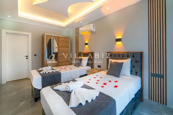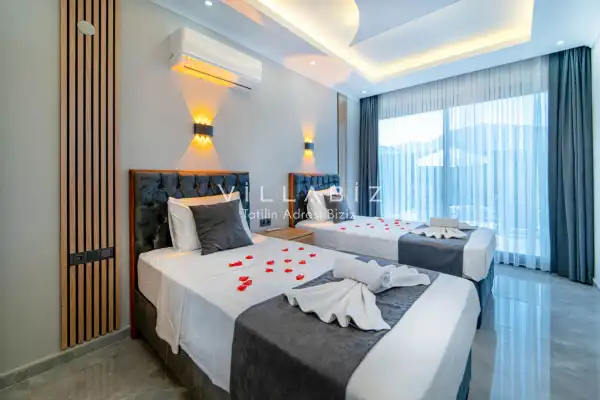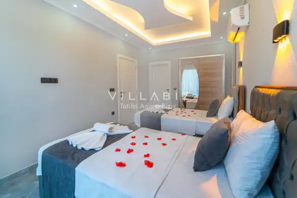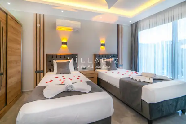Villamız 4 kişilik kapasiteye sahiptir ve 2 yatak odası yer alır. Villanın 3 banyosu ve jakuzisi mevcut. Açık mutfağı ve kendine ait bahçesinde bir havuzu var. Mutfağında bulaşık makinesi, buzdolabı, ankastre fırın, tost makinesi ve mutfakta ihtiyaç olan hemen hemen bütün gereçler bulunuyor. Barbekü, masa, sandalyeler, şezlonglar ve şemsiyeler bahçe keyfini sınırsız yaşamanıza imkan tanıyor. Salonunda oturma grubu, televizyon, eşyalar bulunurken, tüm odalar için ayrı klima imkanı var.