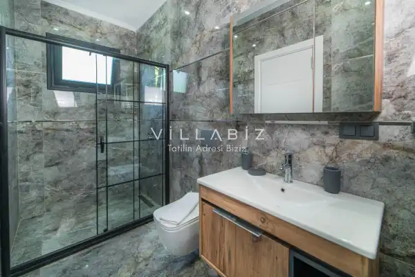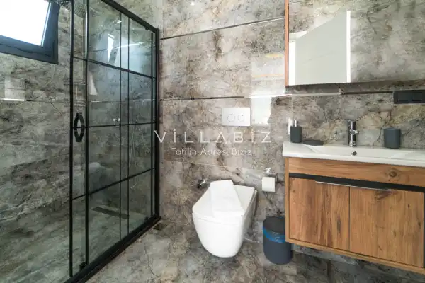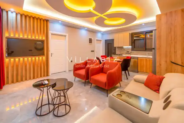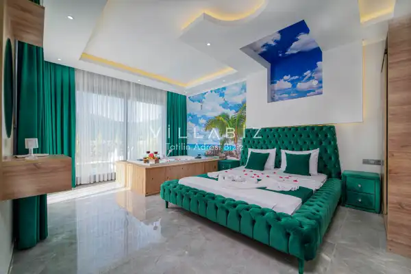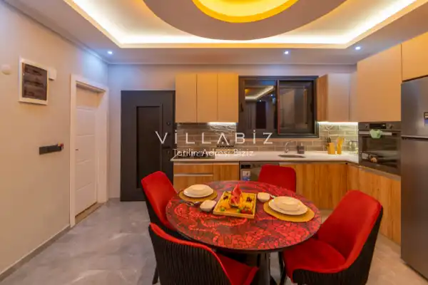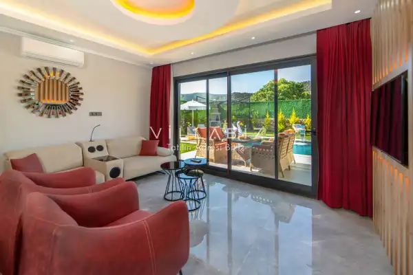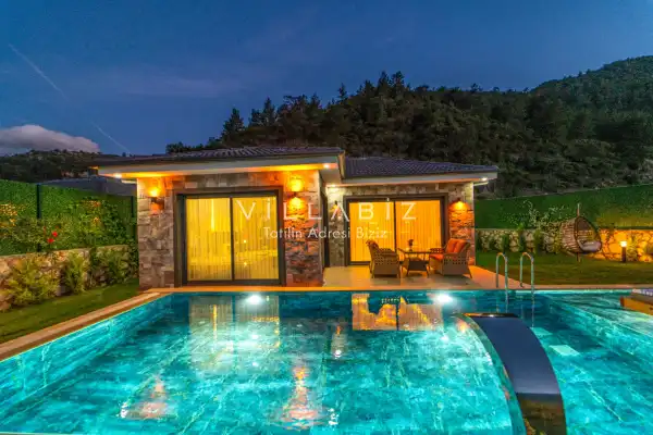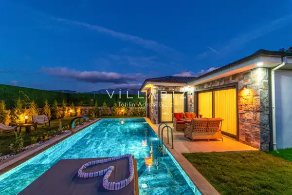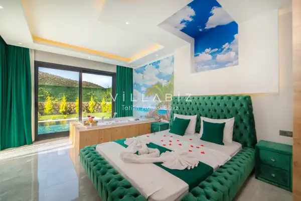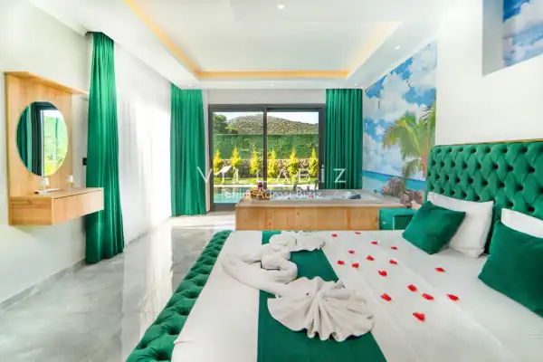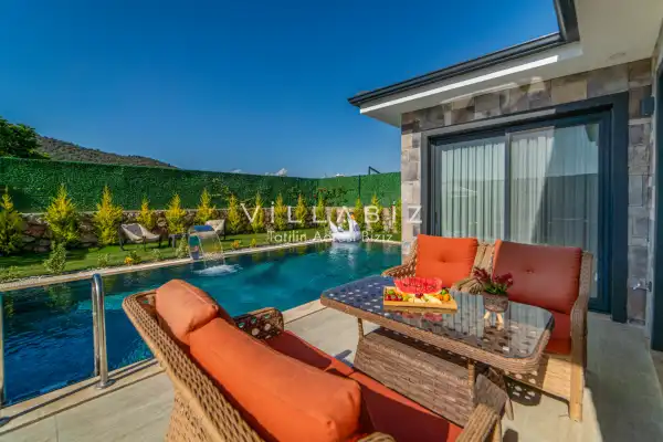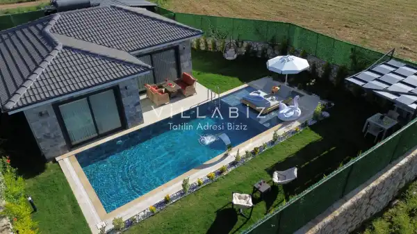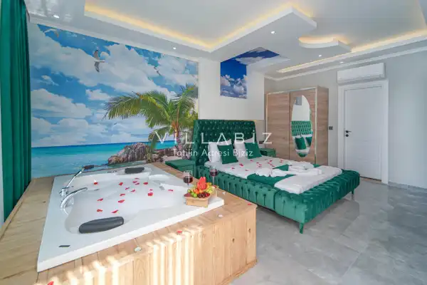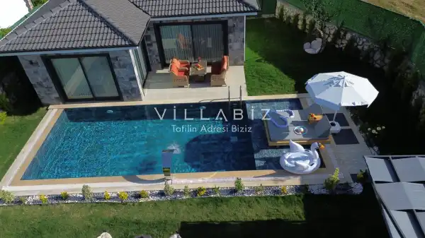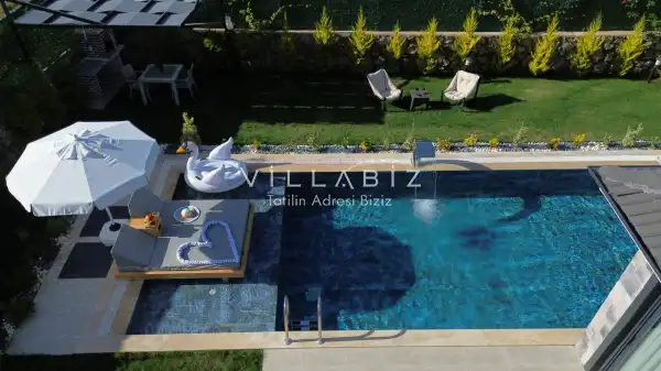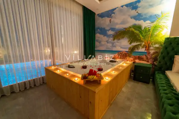 Villamız 2 kişilik kapasiteye sahiptir ve 1 yatak odası yer alır. Villanın 2 banyosu ve jakuzisi mevcut. Açık mutfağı ve kendine ait bahçesinde bir havuzu var. Mutfağında bulaşık makinesi, buzdolabı, ankastre fırın, tost makinesi ve mutfakta ihtiyaç olan hemen hemen bütün gereçler bulunuyor. Barbekü, masa, sandalyeler, şezlonglar ve şemsiyeler bahçe keyfini sınırsız yaşamanıza imkan tanıyor. Salonunda oturma grubu, televizyon, eşyalar bulunurken, tüm odalar için ayrı klima imkanı var.