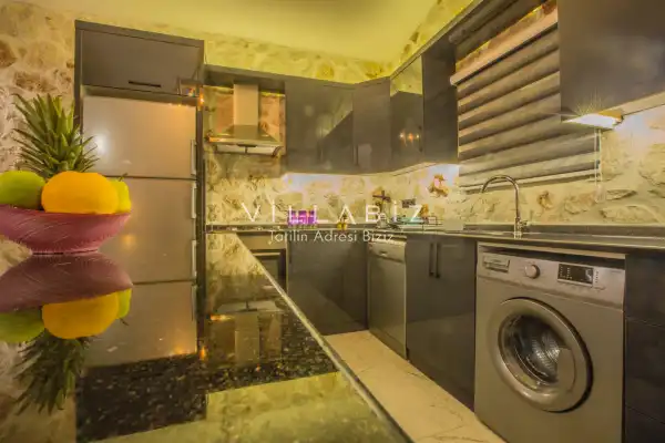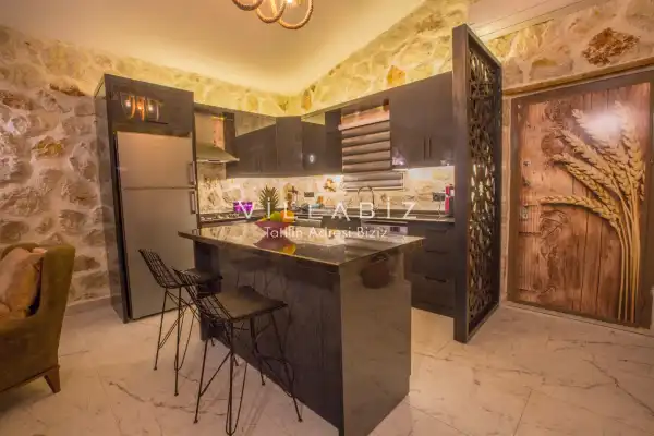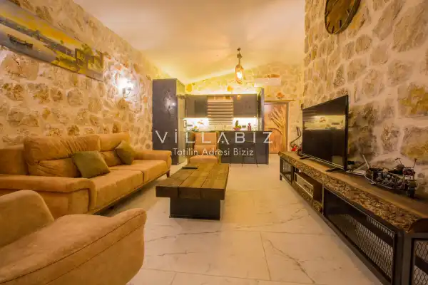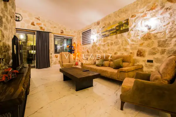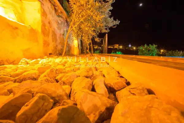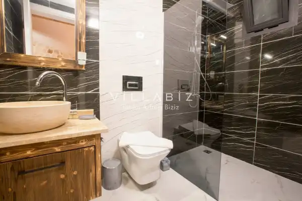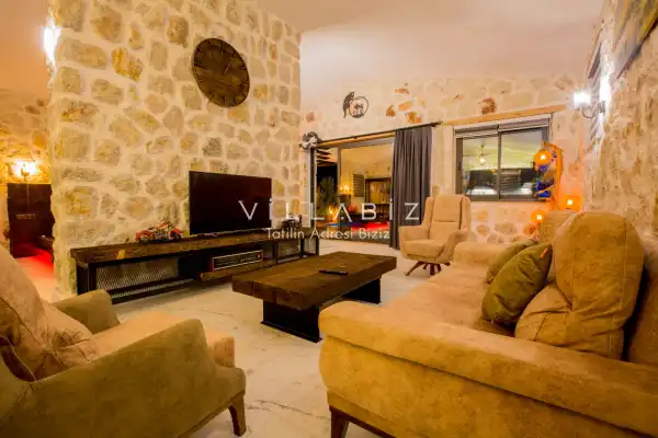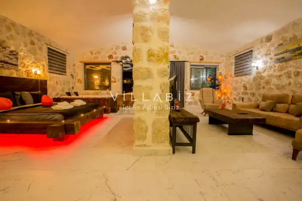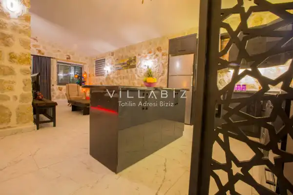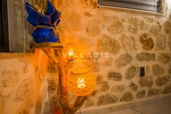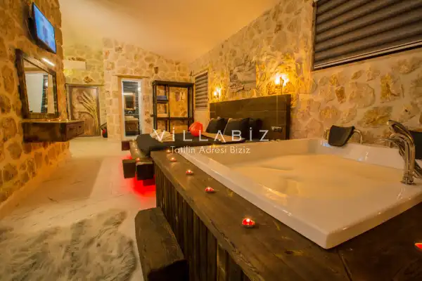 Villanın bir adet  banyosu ve jakuzisi mevcut. Açık mutfağı ve kendine ait bahçesinde bir havuzu var. Mutfağında bulaşık makinesi, buzdolabı, ankastre fırın, tost makinesi ve mutfakta ihtiyaç olan hemen hemen bütün gereçler bulunuyor. Barbekü, masa, sandalyeler, şezlonglar  bahçe keyfini sınırsız yaşamanıza imkan tanıyor. Salonunda oturma grubu, televizyon, eşyalar bulunurken, tüm odalar için ayrı klima imkanı var.