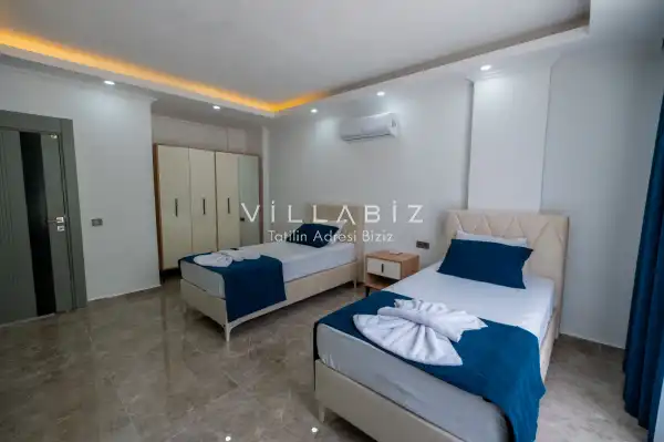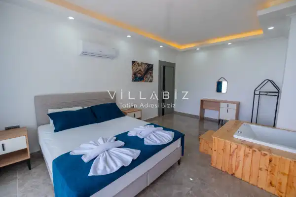 Toplam 4 yatak odasından oluşmuş, 8 kişi konaklama kapasitesine sahiptir. Geniş aileler ve kalabalık arkadaş grupları için oldukça idealdir. Oldukça şık ve modern bir şekilde döşenmiş olan villamızda misafirlerimiz için her şey düşünülmüştür. Havuz terasında bulunan şezlonglarda güneşlenebilir, bahçe masasında muhteşem yemekler yiyebilir, salıncakta sallanıp keyifli dakikalar geçirebilirsiniz.