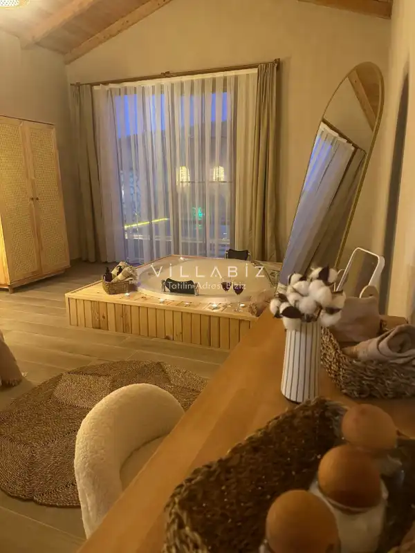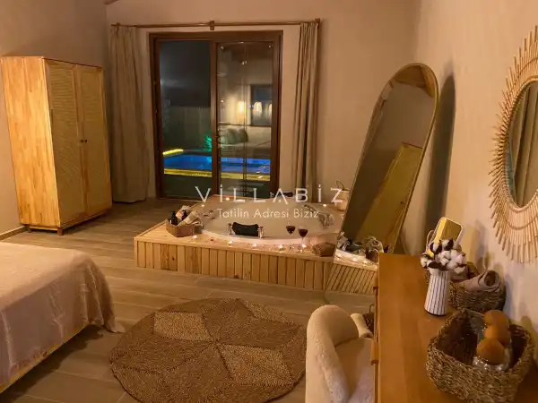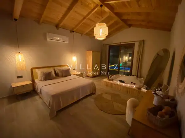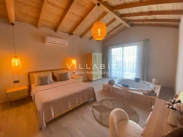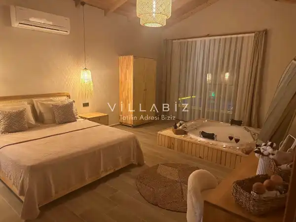 Tek yatak odasından oluşmuş, 2 kişi konaklama kapasitesine sahiptir. Yatak odasında banyosu ve jakuzisi bulunmaktadır. Çekirdek aileler ve balayı çiftleri için oldukça idealdir. Oldukça şık ve modern bir şekilde döşenmiş olan villamızda misafirlerimiz için her şey düşünülmüştür. Havuz terasında bulunan şezlonglarda güneşlenebilir, bahçe masasında muhteşem yemekler yiyebilir, salıncakta sallanıp keyifli dakikalar geçirebilirsiniz.