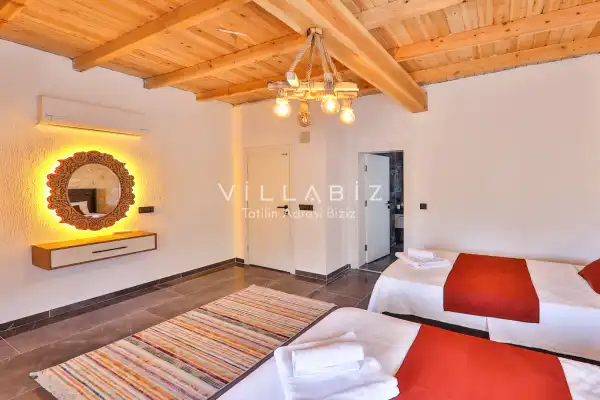 Seydikemer Karadere bölgesinde bulunan Villa Sandak 1, 6 kişi konaklama kapasitesine sahip 3 yatak odalı villa seçeneklerimizdendir. Korunaklı havuz alanına sahip villamız muhafazakar aileler ve arkadaş grupları için de oldukça idealdir. 2 yatak odası ebeveyn banyolu ve jakuzili, 3. yatak odası ise 2 adet tek kişilik yatak ve banyoludur. Villamızda buna ek olarak sauna ve Türk Hamam'ı mevcuttur.
