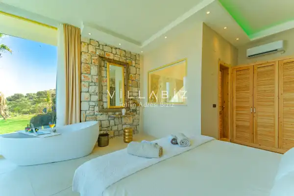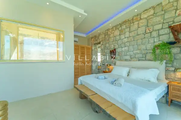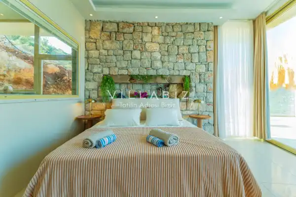 Villamız 2 yatak odası bulunmaktadır, İki yatak odası havuz katında, diğer yatak odası alt katta bulunmaktadır. Alt kat yatak odası bağımsız girişli bir dairedir. 3 yatak odalı olalarak kullanılmak istenirse günlük 350 EURO eklenmektedir.