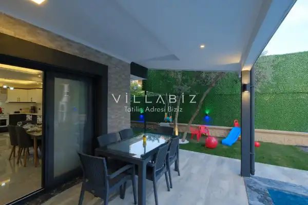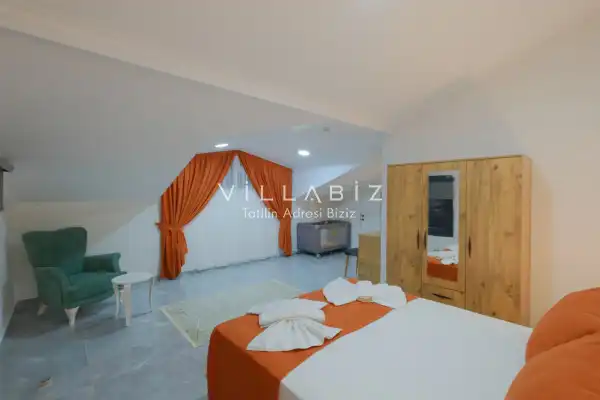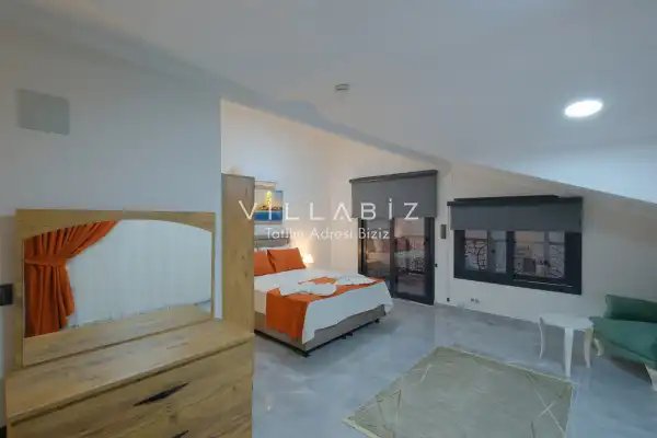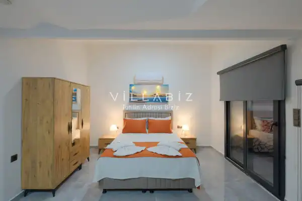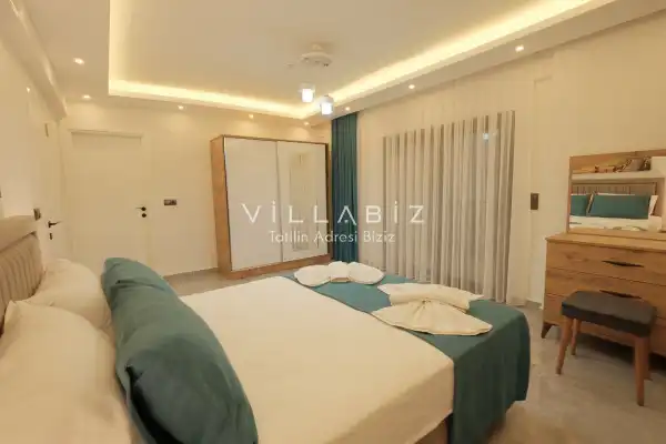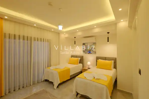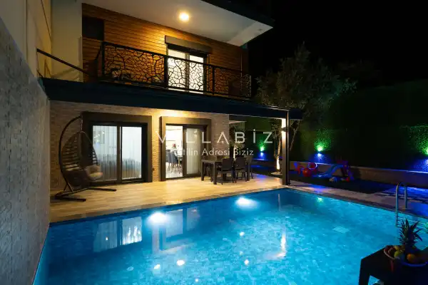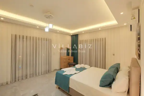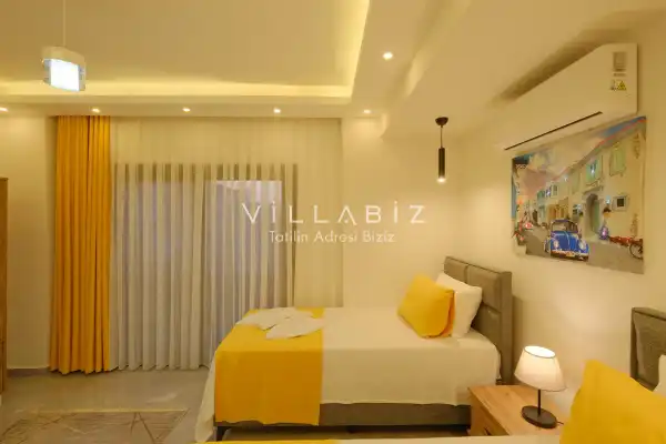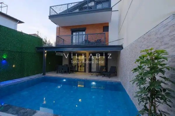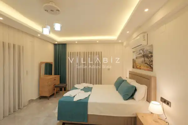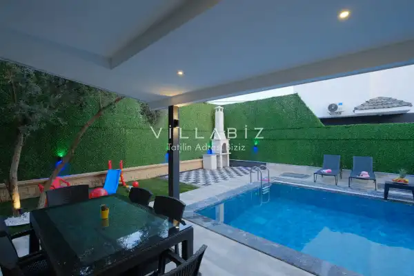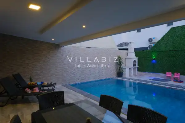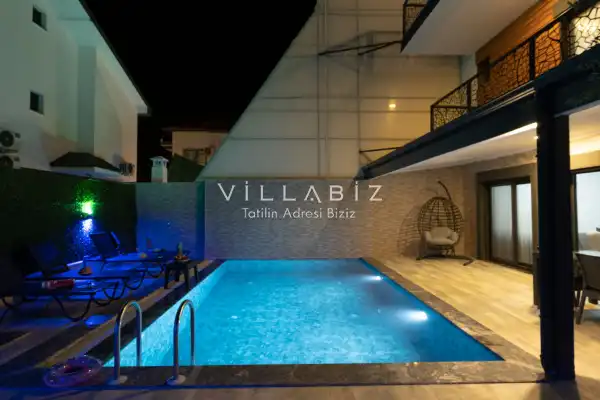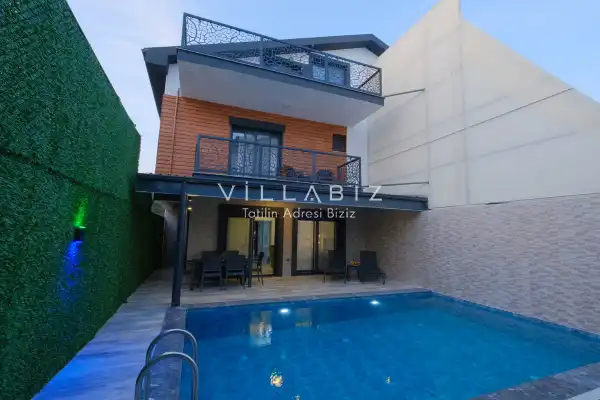 Toplam 3 yatak odasından oluşmuş, 6 kişi konaklama kapasitesine sahiptir. Geniş aileler ve kalabalık arkadaş grupları için oldukça idealdir. Oldukça şık ve modern bir şekilde döşenmiş olan villamızda misafirlerimiz için her şey düşünülmüştür. Havuz terasında bulunan şezlonglarda güneşlenebilir, bahçe masasında muhteşem yemekler yiyebilir, salıncakta sallanıp keyifli dakikalar geçirebilirsiniz.