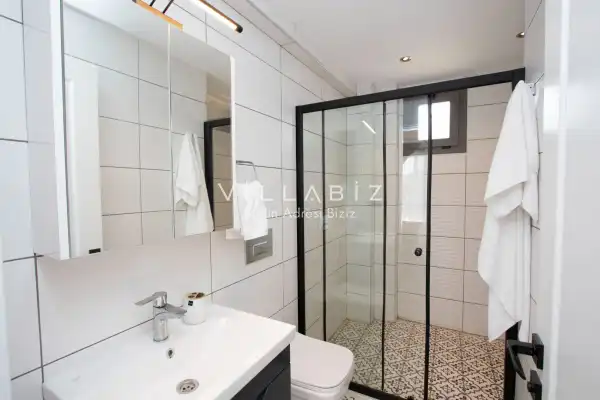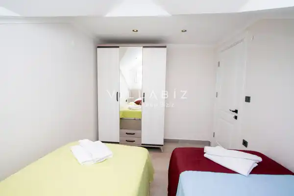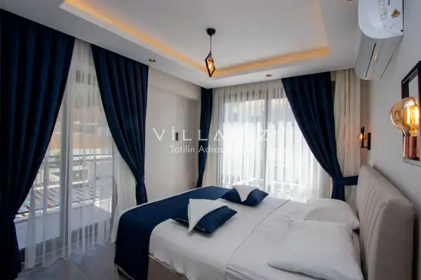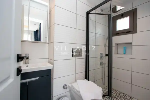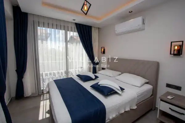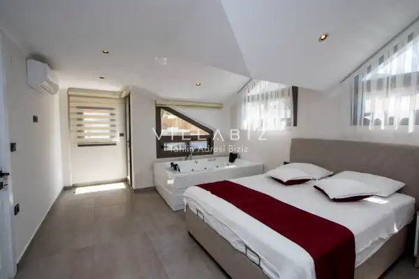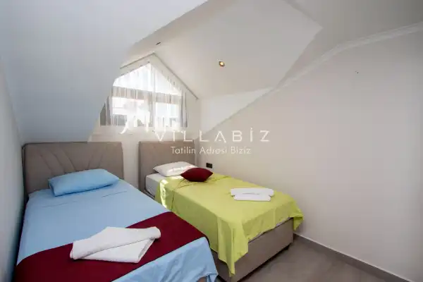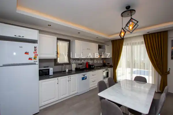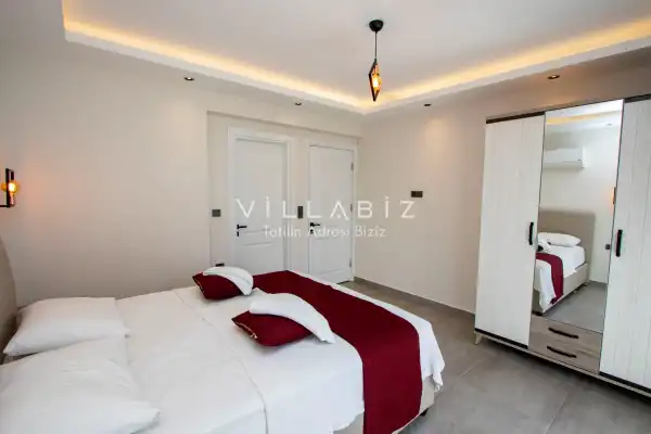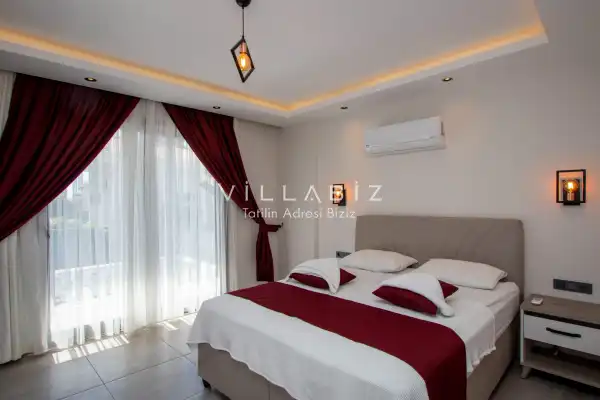 Toplam 4 yatak odasından oluşmuş 8 kişi konaklama kapasitesine sahiptir. Geniş aileler ve kalabalık arkadaş grupları için oldukça idealdir. Oldukça şık ve modern bir şekilde döşenmiş olan villamızda misafirlerimiz için herşey düşünülmüştür. Havuz terasında bulunan şezlonglarda güneşlenebilir, bahçe masasında muhteşem yemekler yiyebilir, salıncakta sallanıp keyifli dakikalar geçirebilirsiniz. Villanın bahçesinde özel havuzun yanında çocuklar için bir de çocuk havuzu mevcut.