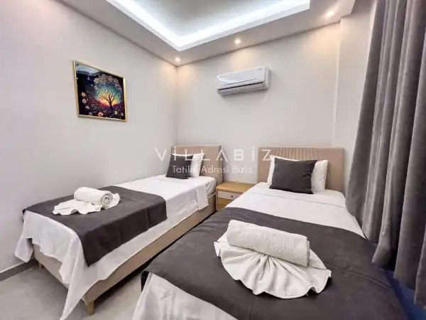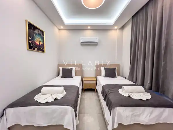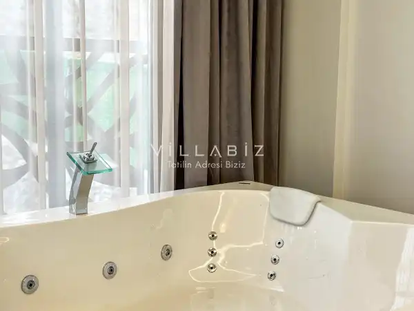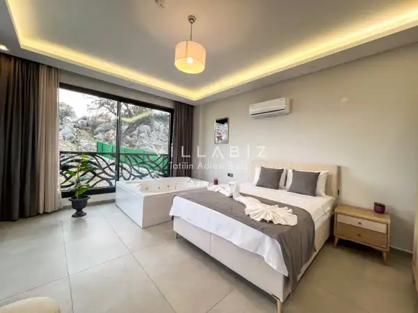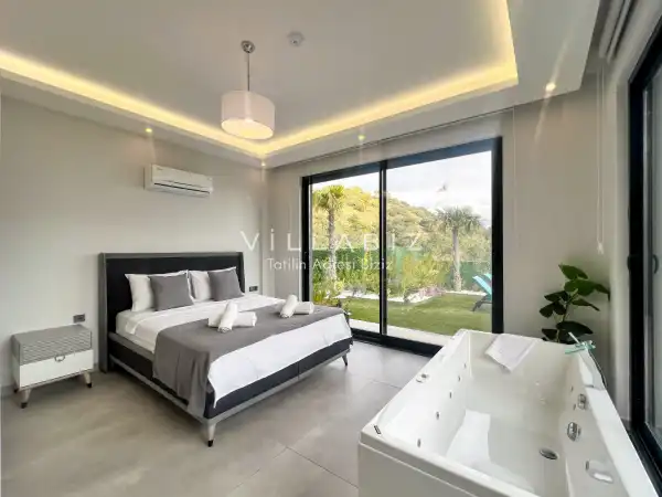 Toplam 3 yatak odasından oluşmuş, 6 kişi konaklama kapasitesine sahiptir. Geniş aileler ve kalabalık arkadaş grupları için oldukça idealdir. Oldukça şık ve modern bir şekilde döşenmiş olan villamızda misafirlerimiz için her şey düşünülmüştür. Havuz terasında bulunan şezlonglarda güneşlenebilir, bahçe masasında muhteşem yemekler yiyebilir, salıncakta sallanıp keyifli dakikalar geçirebilirsiniz.