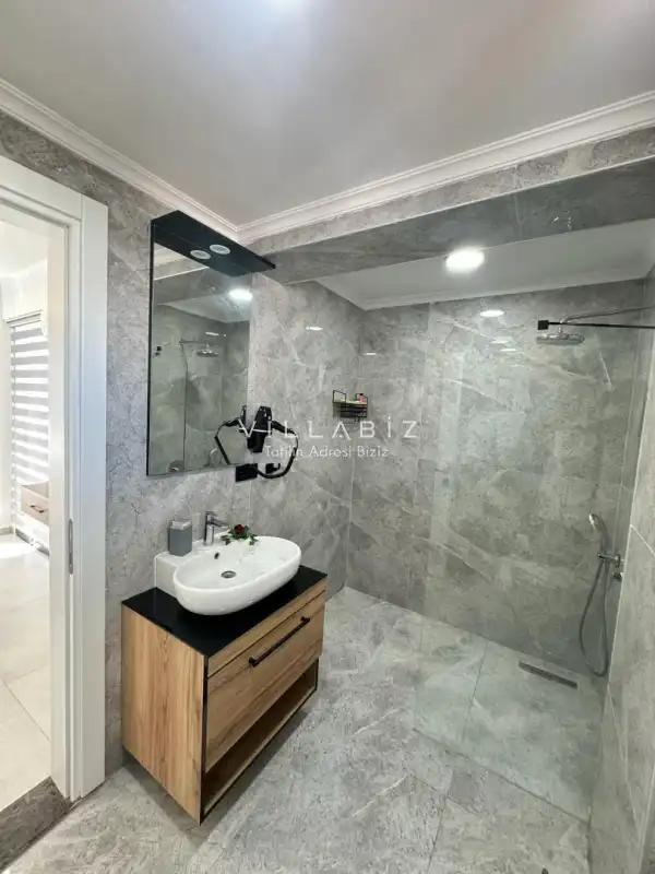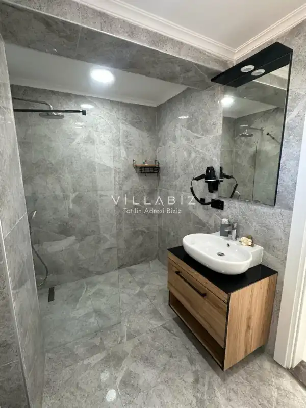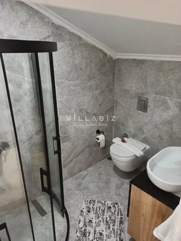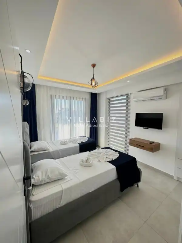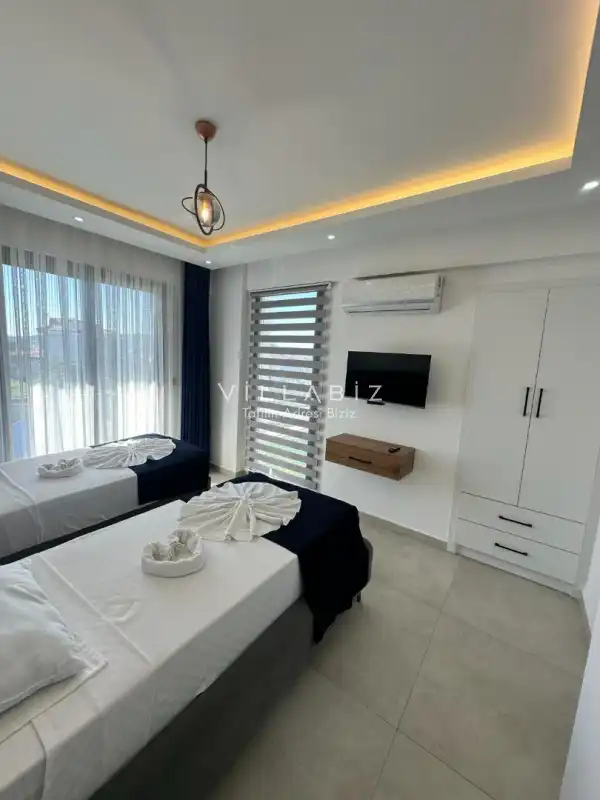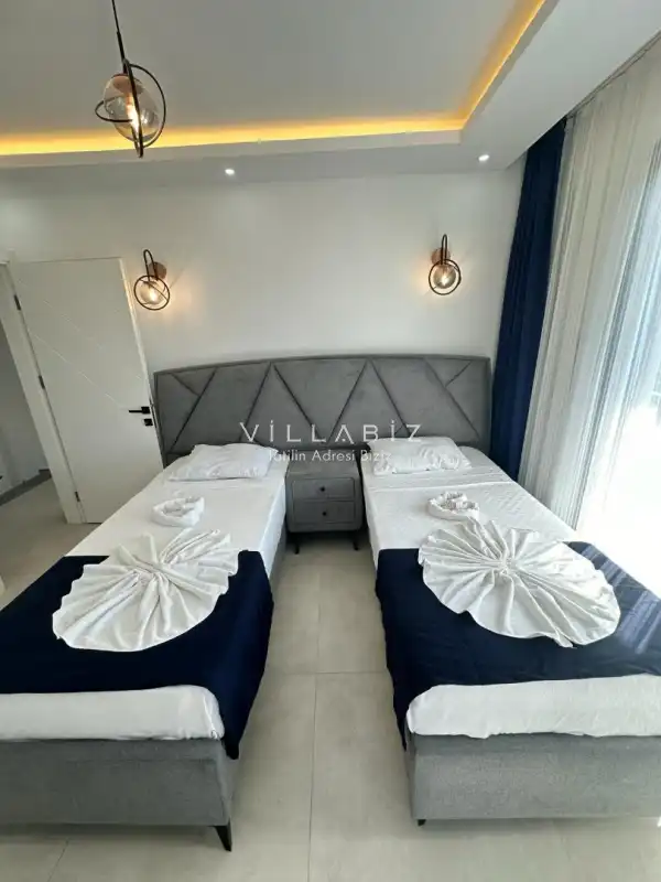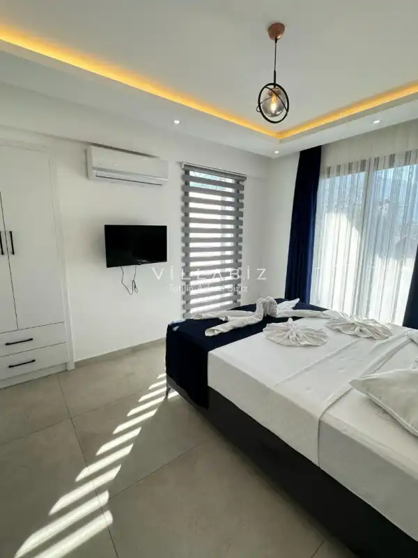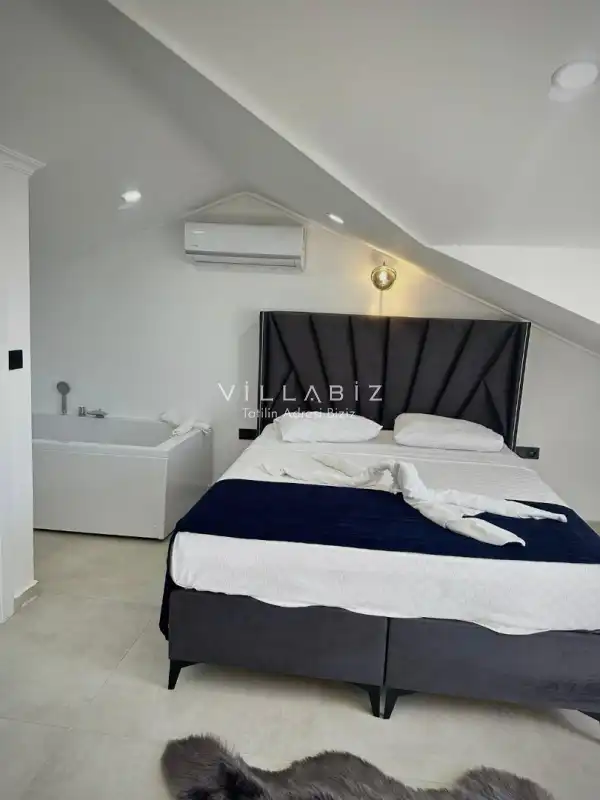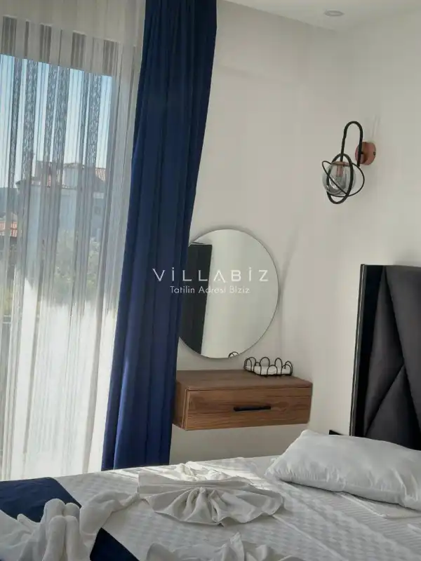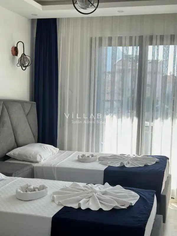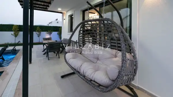 Toplam 3 yatak odasından oluşmuş, 6 kişi konaklama kapasitesine sahiptir. Geniş aileler ve kalabalık arkadaş grupları için oldukça idealdir. Oldukça şık ve modern bir şekilde döşenmiş olan villamızda misafirlerimiz için her şey düşünülmüştür. Havuz terasında bulunan şezlonglarda güneşlenebilir, bahçe masasında muhteşem yemekler yiyebilir, salıncakta sallanıp keyifli dakikalar geçirebilirsiniz.