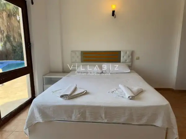 Toplam 4 yatak odasından oluşmuş, 8 kişi konaklama kapasitesine sahiptir. Geniş aileler ve kalabalık arkadaş grupları için oldukça idealdir. Oldukça şık ve modern bir şekilde döşenmiş olan villamızda misafirlerimiz için her şey düşünülmüştür. Havuz terasında bulunan şezlonglarda güneşlenebilir, bahçe masasında muhteşem yemekler yiyebilir, salıncakta sallanıp keyifli dakikalar geçirebilirsiniz.