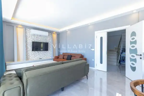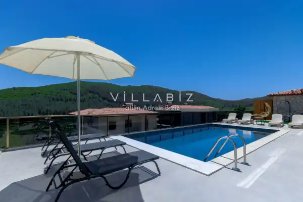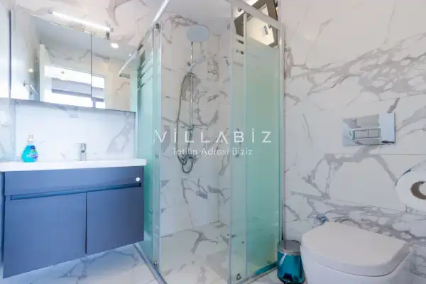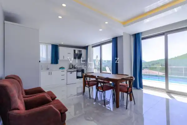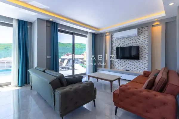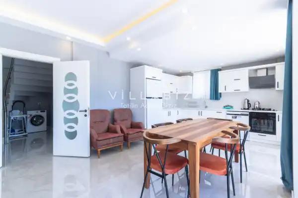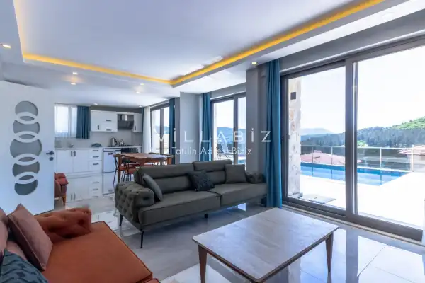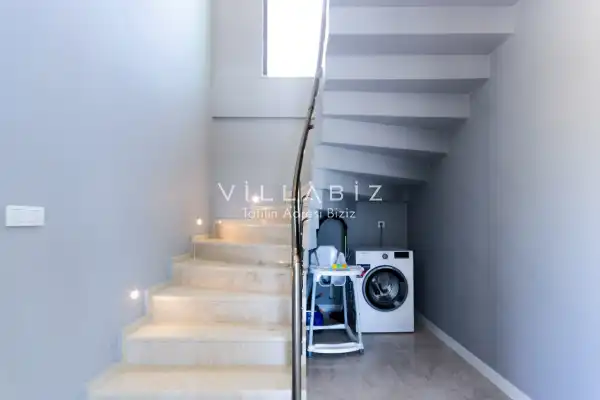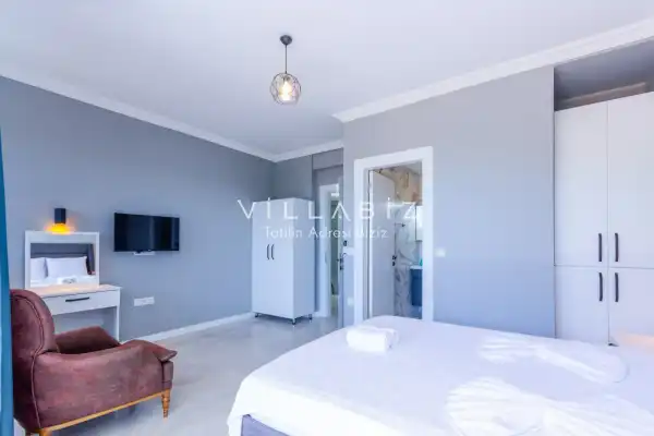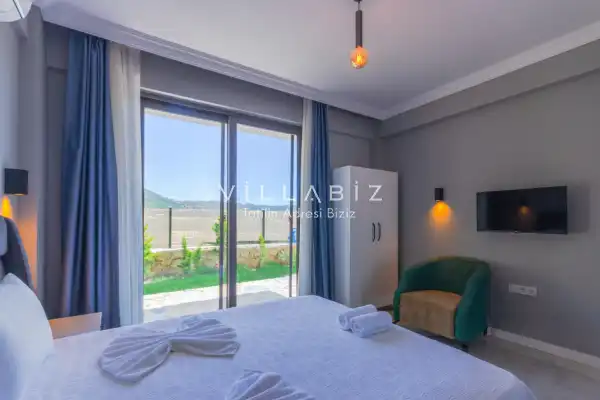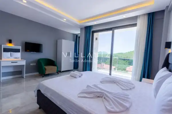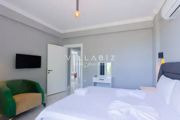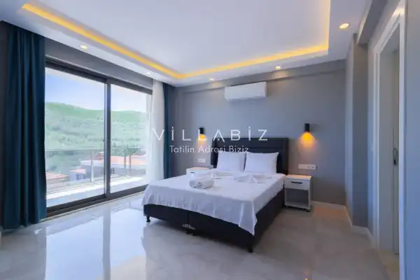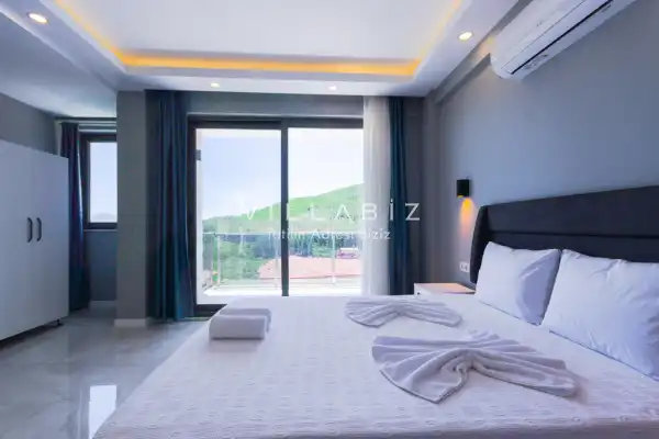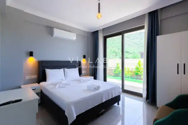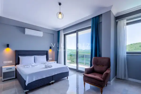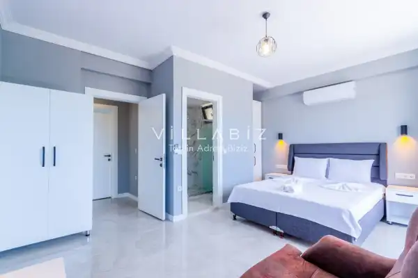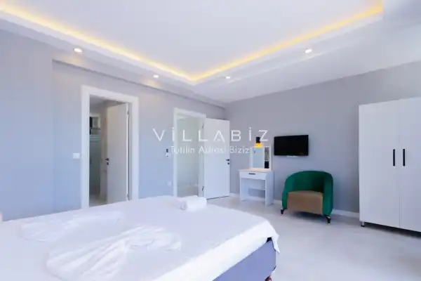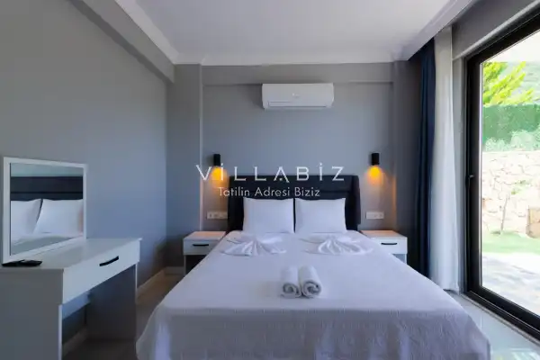 Villa 4 yatak odalı olup 8 kişilik konaklama kapasitesine sahiptir. 1. Yatak odasında konforlu bir çift kişilik yatak, klima, elbise dolabı ve ebeveyn banyosu; 2. Yatak odasında konforlu bir çift kişilik yatak, klima, elbise dolabı ve ebeveyn banyosu; 3.Yatak odasında konforlu bir çift kişilik yatak, klima, elbise dolabı ve ebeveyn banyosu; 4. Yatak odasında konforlu çift kişilik yatak, klima, elbise dolabı bulunmaktadır. Salon bölümünde modern oturma grubu, televizyon, klima ve açık plan tam donanımlı mutfak yer almaktadır. Mutfakta buzdolabı, ocak, fırın, yemek takımları ve temel mutfak ekipmanları eksiksiz şekilde sunulmaktadır.